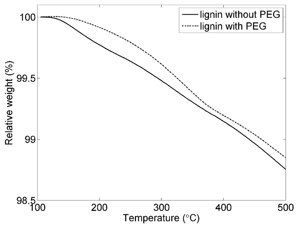 In order to investigate the effect of PEG as plastizer, TGA was utilized to characterize the results relating to the positive electrodes bound using lignin with and without PEG are shown in Figure 7. It is obvious that the decomposition temperatures (Td) of the electrode using lignin with PEG are higher than that of only lignin. The electrode without PEG started to lose weight at 125 °C. However, the electrode with PEG began to decompose at 151 °C. Volatiles (V) at 250 °C for the electrode with PEG was about 99.8%, which is higher than 99.6% without PEG.