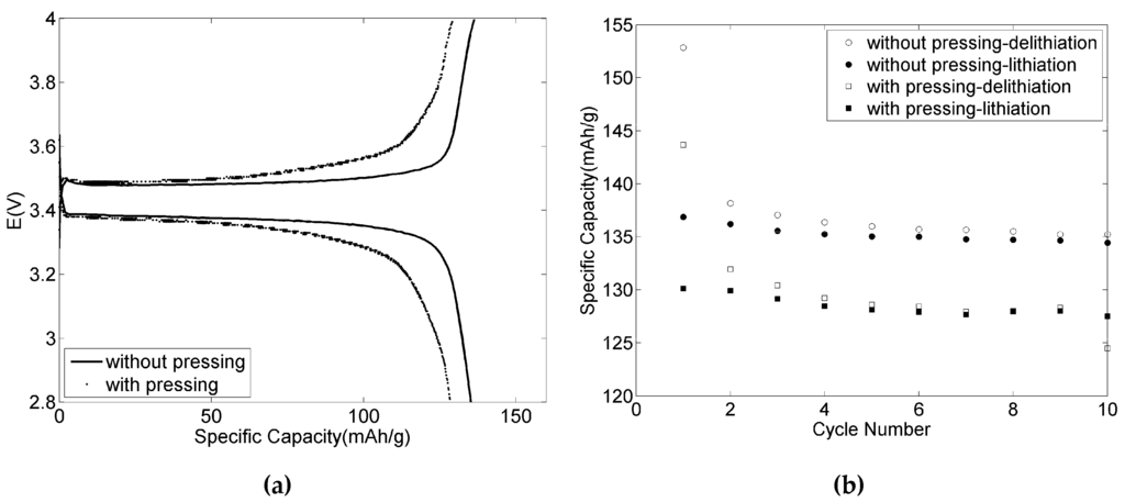 Galvanostatic 4th charge/discharge voltage profiles cycled at C/10 at room temperature (a) and specific capacity versus cycle numbers (b) for 82-9-9 LiFePO4 positive electrodes with and without pressing.