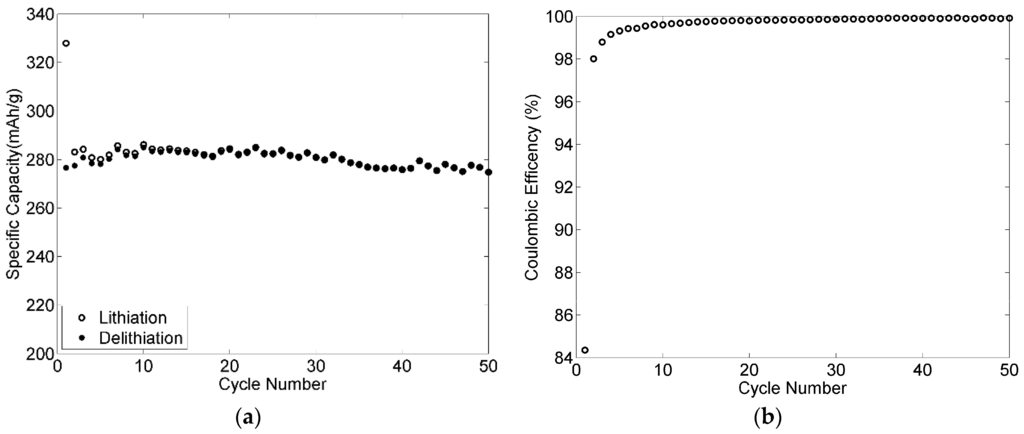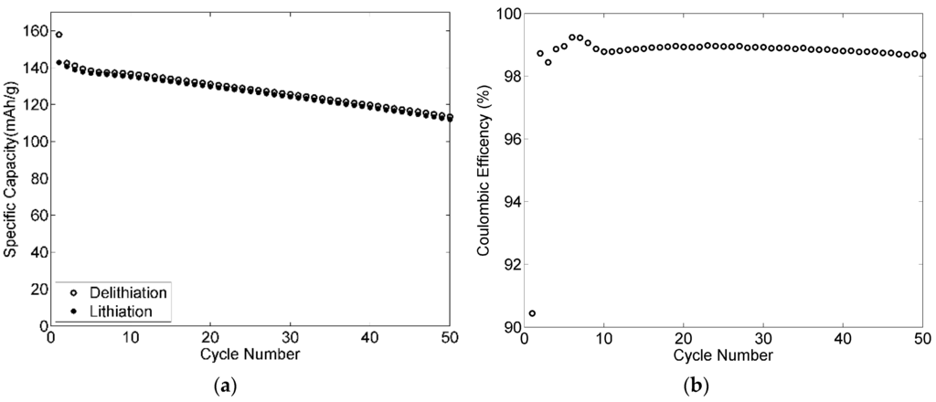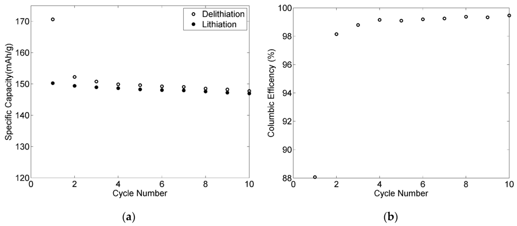 Figure 12 shows the specific capacity and coulombic efficiency during the first ten cycles of a LiFePO4 positive electrode. The first cycle coulombic efficiency (ratio discharge/charge) was 88%, after three cycles over 99% and then remained stable in subsequent cycles. High reversible capacity was obtained (about 148 mAh·g−1), which is not far away from the theoretical capacity of lithium iron phosphate using PVDF as a binder (approximately 170 mAh·g−1). The specific capacity was maintained throughout the subsequent cycles, indicating fairly good cycling performance.