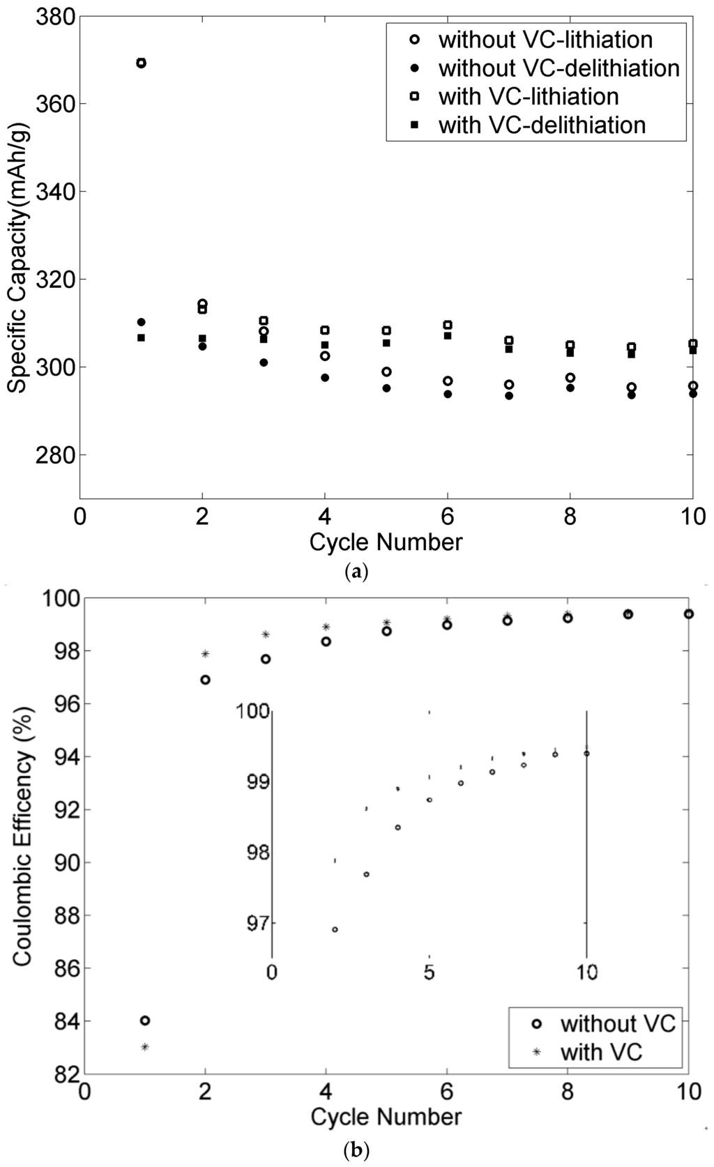 VC is a well-known additive for enhancing the cycling performance of an electrode [30]. The effect of VC for the negative electrode with lignin binder is presented in Figure 14. The observed irreversible capacity of the first cycle is attributed to formation of the solid electrolyte interface (SEI). After the first cycle, both the specific capacity and coulombic efficiency were overall slightly higher in the presence of VC as shown in Figure 14a,b. The specific capacity of the electrode with VC maintained a stable value of about 305 mAh·g−1 throughout the subsequent cycles. However, it decreased gradually for the electrode in VC-free electrolyte. The coulombic efficiency shown in Figure 14b was higher in the presence of VC during the first cycles, but the effect declined with prolonged cycling and had almost vanished after 10 cycles.