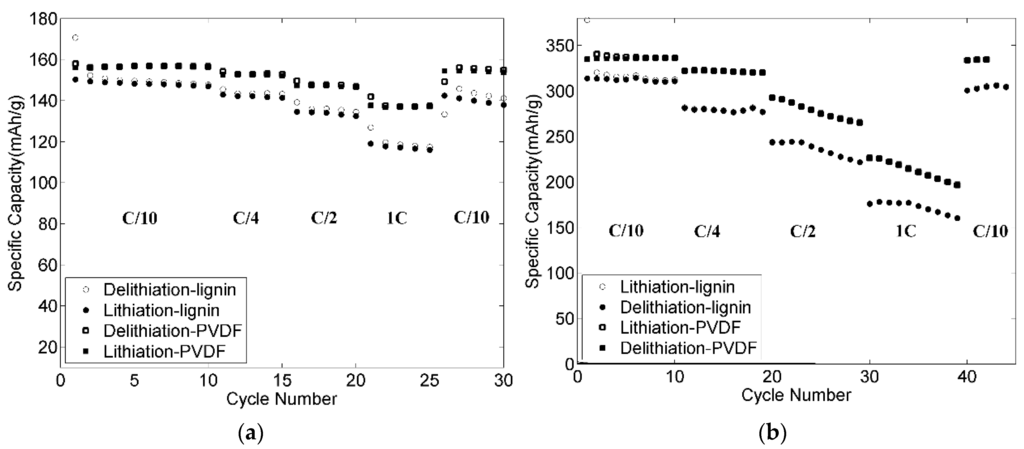 Rate capability evaluations of both positive and negative electrodes were performed (see Figure 15). The capacity was slightly decreased from 148 to 142 mAh·g−1 when changing cycling rate from C/10 to C/4. After 15 cycles at C/2, the electrode still showed good electrochemical performance with 134 mAh·g−1, which delivers over 90% of the capacity at C/10. At the high rate 1C, the electrode maintained a capacity of 117 mAh·g−1, which represents approximately 80% of the specific capacity at C/10. After 25 cycles, the current rate was returned to C/10 and the specific capacity was quite similar to the capacity at C/10 for the first ten cycles. Figure 15b shows the rate capabilities of the negative electrode. For the first 10 cycles at C/10, the reversible specific capacity was around 305 mAh·g−1. When changing from the rate C/10 to C/4, a stable specific capacity of about 280 mAh·g−1 was obtained. A further 10 cycles at C/2 rate yielded a specific capacity of 220 mAh·g−1. Even at the high rate of 1C, the electrode kept a specific capacity of above 160 mAh·g−1. After 40 cycles at different current rates, the electrode was tested at the rate of C/10 again and achieved a stable specific capacity, which is similar to the first 10 cycles at C/10. The specific capacities at different C rates of the electrodes with lignin as binder were lower than for the electrodes using PVDF as binder. However, these results show that both the positive and negative electrodes with lignin as binder have fairly good rate capabilities. In future work, modifying the lignin as binder will be investigated for higher loadings and better electrochemical properties.