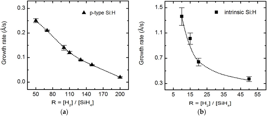 Deposition rates of (a) n-, (b) i-, and (c) p-layers on ZnO/Ag, n-layer/ZnO/Ag, and i-layer/glass, respectively, as functions of R.