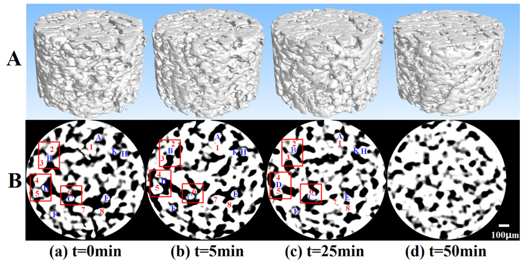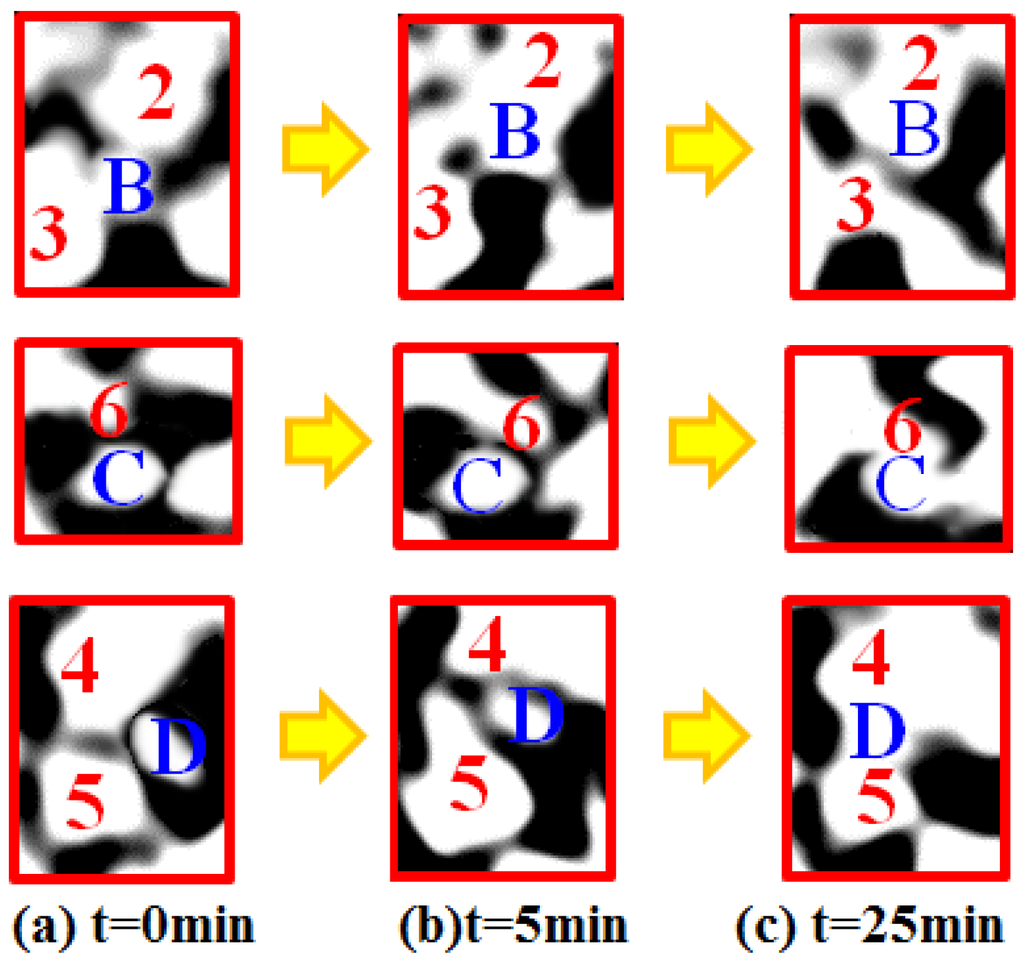 Figure 2B(a,b). From these images, the microstructure evolution can be clearly observed. For example, particle B was separated from particles 2 and 3 at the beginning. However, until the 5th minute, particle B was sintered together with particles 2 and 3. The local amplification images of these particles are shown in