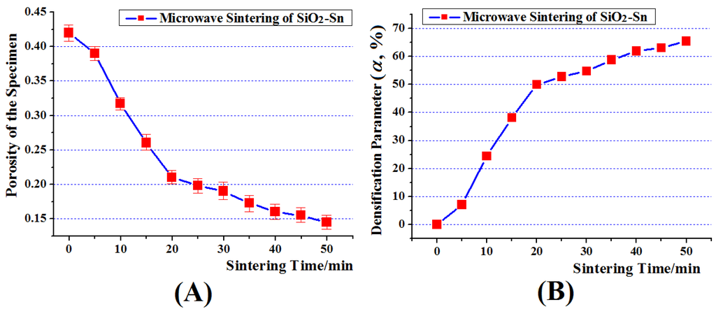 Figure 2B(d) the shape of pores changed and became closed and isolated. This means the specimen gradually changed from loose to dense. These phenomena were in accordance with the sintering theory and can also be observed insolid microwave sintering (e.g., Al-SiC, [