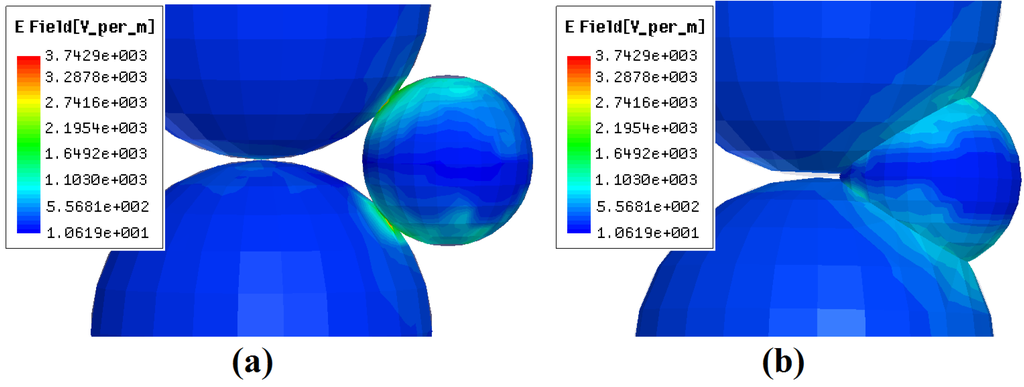 3 v/m, which is about 15.88 times larger than the applied field. In the actual sintering, the intensity of the applied field will be very high, so the peak E-field within the neck region between SiO
