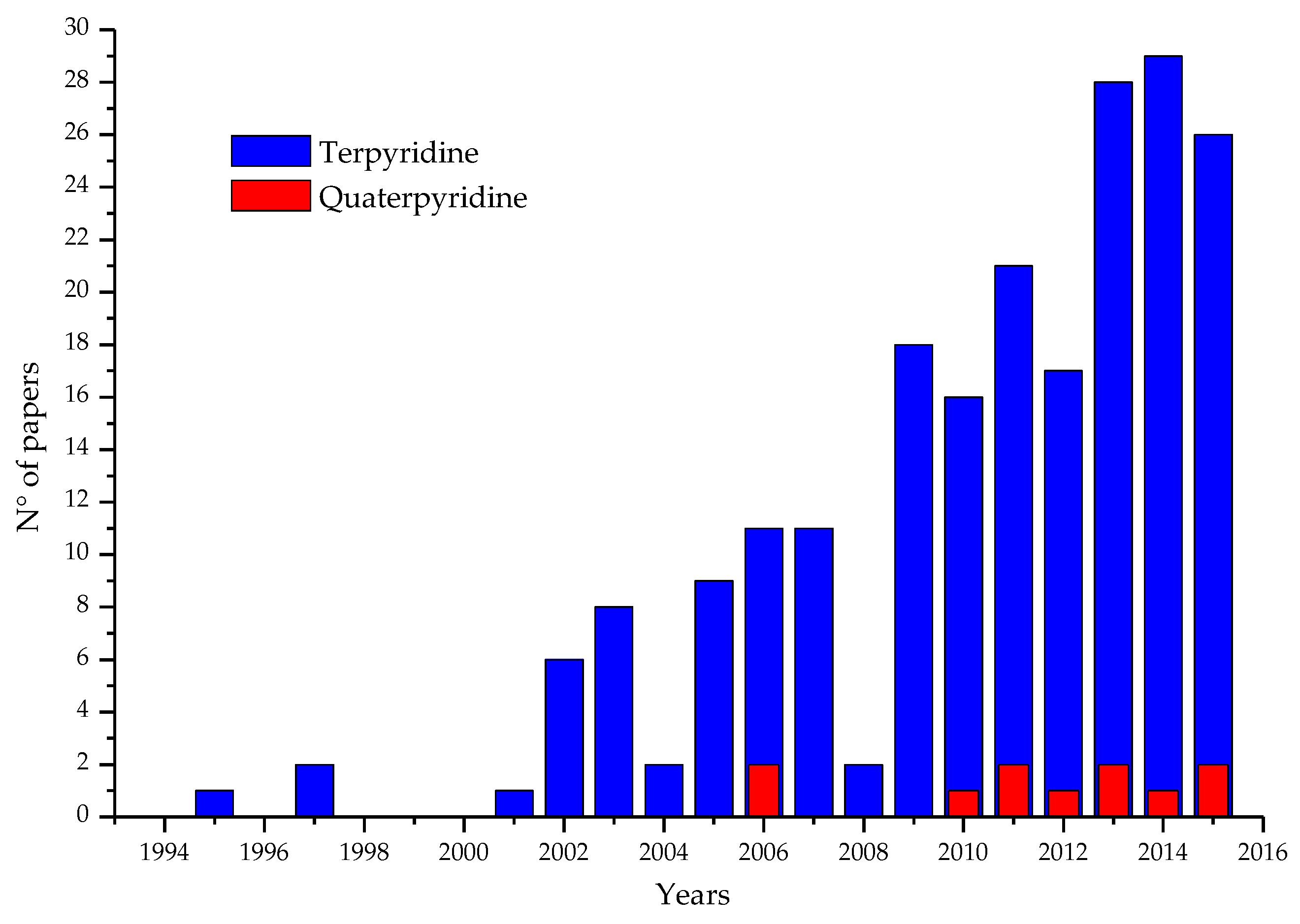 Publications concerning the use of terpyridines (blue) and quaterpyridines (red) in DSCs. Source: SciFinder (January 2016) [15].