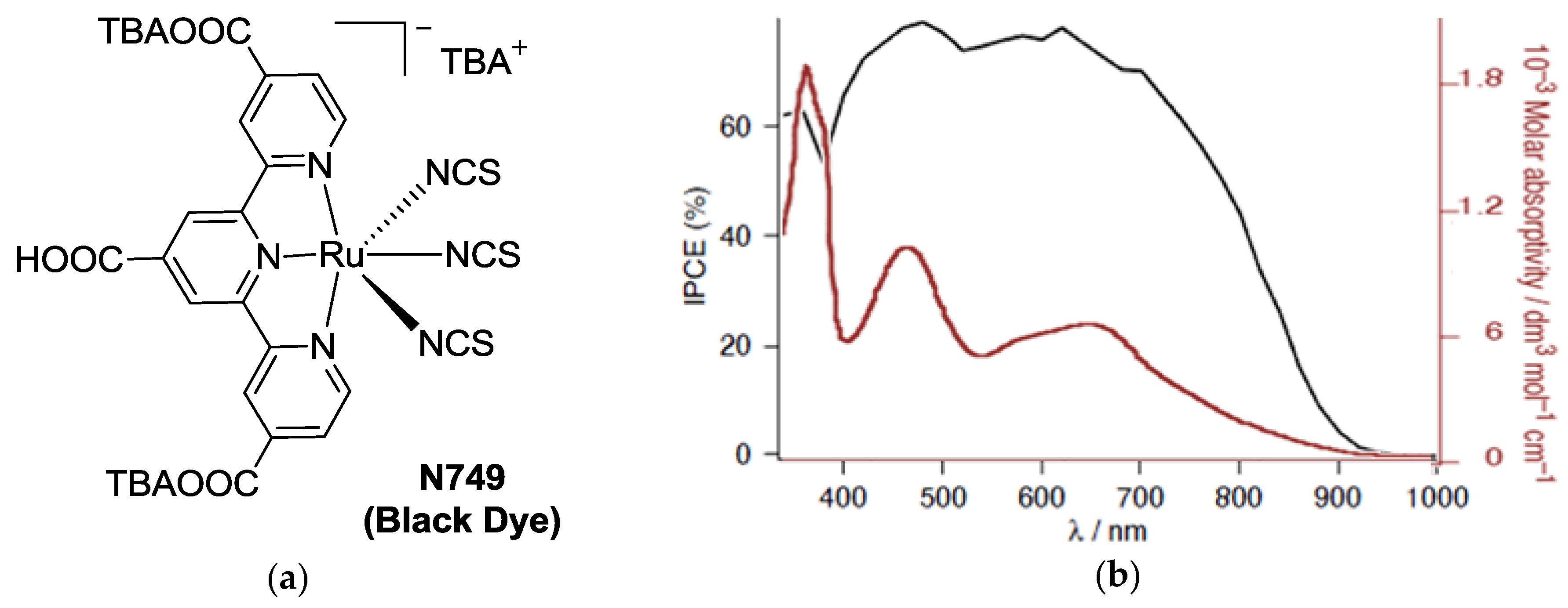 (a) Black Dye (BD) or N749 structure; (b) light absorption spectrum (red) and IPCE (black) [12] (Adapted from Ref 12 with permission of The Royal Society of Chemistry); and (c) crystal structure showing intermolecular hydrogen bonding [21] (Reprinted with permission from Nazeeruddin, M. K.; Péchy, P.; Renouard, T.; Zakeeruddin, S. M.; Humphry-Baker, R.; Comte, P.; Liska, P.; Cevey, L.; Costa, E.; Shklover, V.; Spiccia, L.; Deacon, G. B.; Bignozzi, C. A.; Grätzel, M. Engineering of efficient panchromatic sensitizers for nanocrystalline TiO2-based solar cells. J. Am. Chem. Soc. 2001, 123, 1613–1624. Copyright 2001 American Chemical Society).