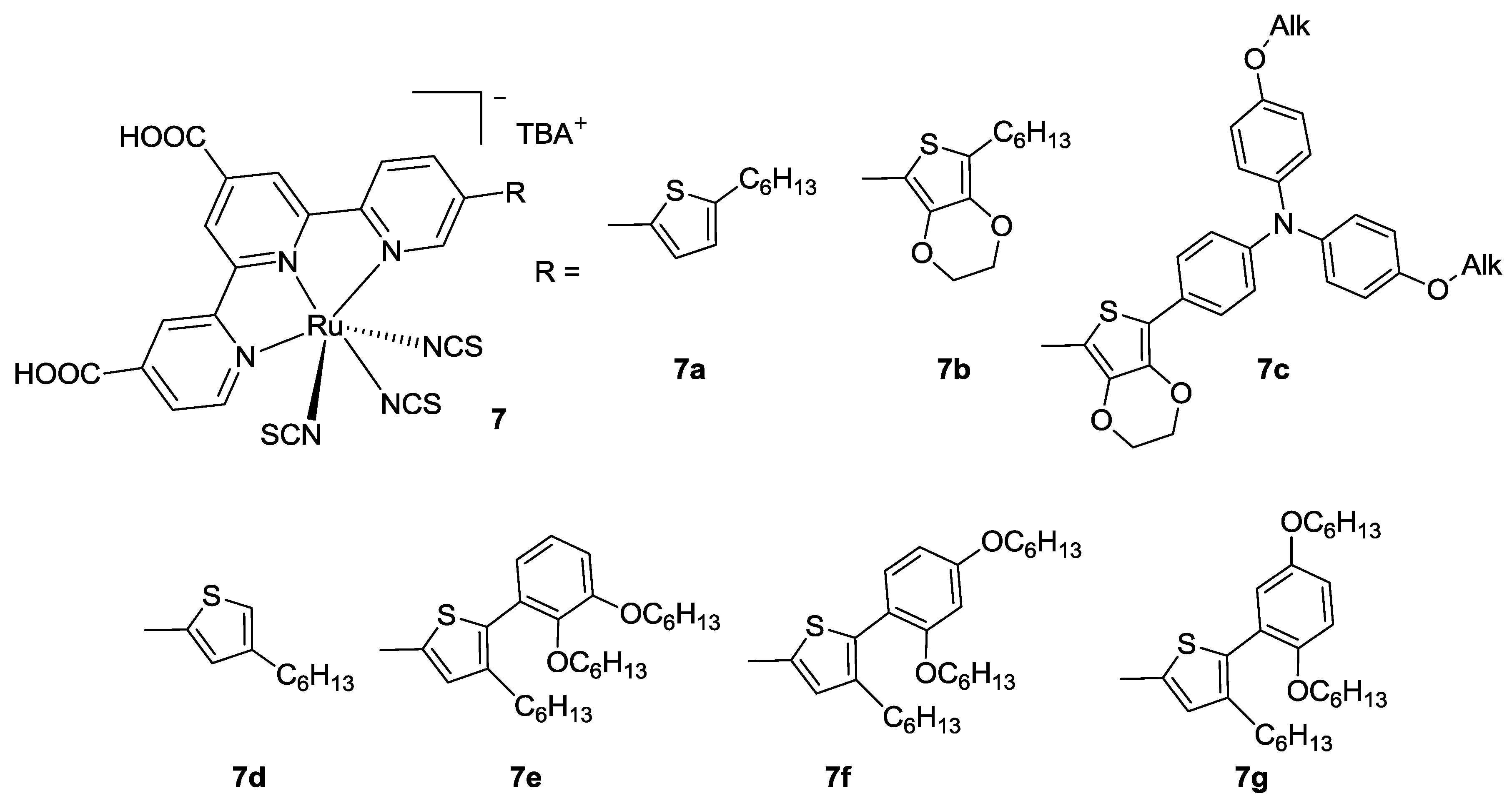 In 2011 Yang et al. [78] tested a series of 4,4'-dicarboxy terpyridine bearing a thiophene or a 3,4-ethylenedioxythiophene in 5’’ position (7a,b in Figure 9). The substitution of the latter with a triphenylamino moiety (7c) resulted in better performances with respect to BD tested in the same conditions (η = 8.29% vs. 6.89%; TiO2: 10 μm + 5 μm, dye: 0.3 mM ethanol + 10 mM chenodeoxycholic acid (CDCA), electrolyte: 0.6 M MDPII, 0.5 M t-bupy, 0.05 M I2, 0.1 M LiI in CH3CN), owing to the higher molar extinction coefficients in the high energy region of the spectrum. Substitution with hexyl-EDOT (7b, EDOT: 3,4-ethylenedioxythiophene) afforded even higher efficiency (η = 10.3% with TiO2: 15 + 5 μm). Similar modifications have been taken into consideration by Kimura et al. [79] (7d–g in Figure 9). In the series, structures with hindered hexyloxy-substituted rings resulted in better performances, probably because of the hindrance of alkyl chains towards the electrolyte, thus avoiding the redox couple to interact with titania and considerably reducing the dark current. Among these, the best results were obtained when the electron donor hexyloxy groups on the phenyl ring are in ortho or para positions (7f in Figure 9).