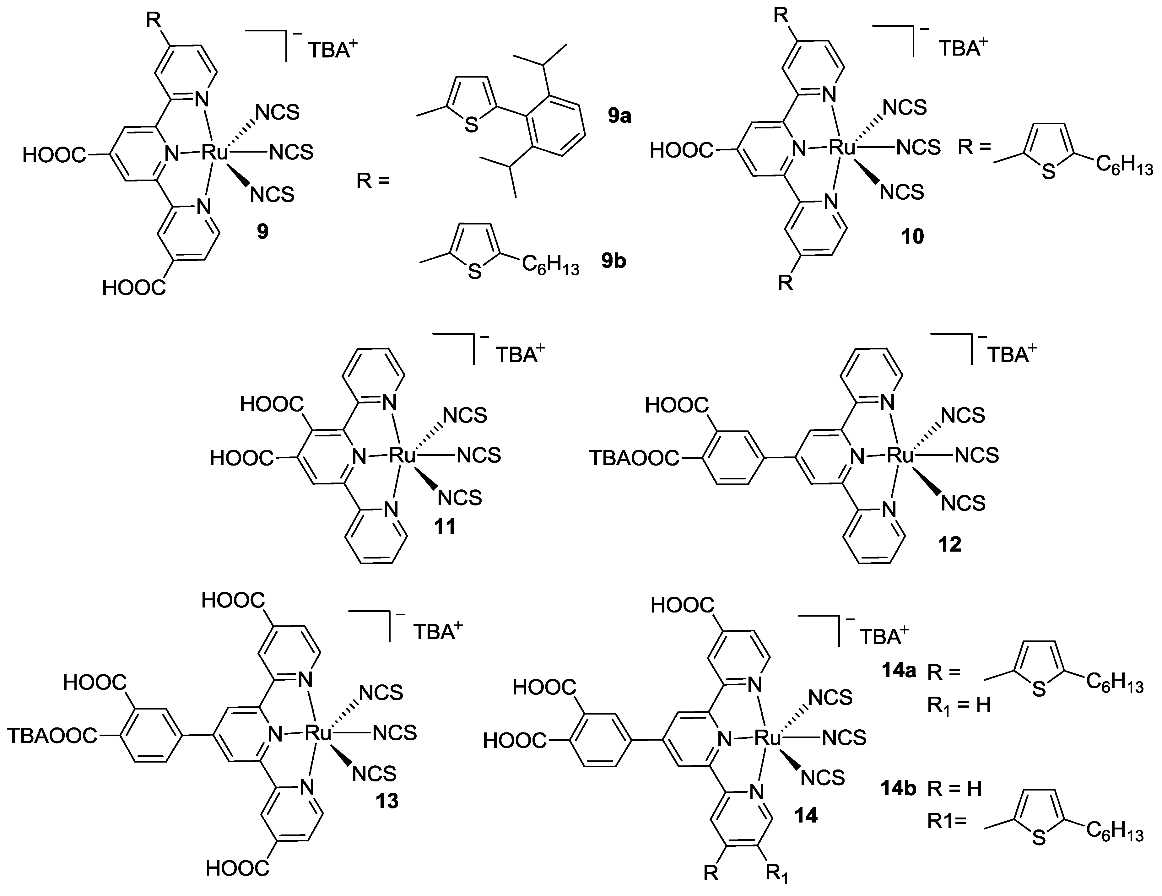 Ozawa et al. proposed a series of tpy having anchoring groups either in the classical 4-, 4’- and 4’’-positions or 3’-, 4’-positions, obtaining mono, bis, tri, and tetra-anchored complexes (Figure 11) [82,83]. Substitution with hexylthiophene in 3- or 4-positions was also investigated by impedance spectroscopy (EIS) and open circuit voltage decay (OCVD), revealing that charge recombination with electrolyte solution is largely promoted when compared to the carboxylic-modified one (Figure 10) [84,85]. Efficiencies close to the BD reference were recorded for the tetra-anchored complex 13, and for the 4’’-thienyl dicarboxy substituted complexes 9. The symmetric substitution with two hexyltiophene groups was also taken into consideration [86,87].