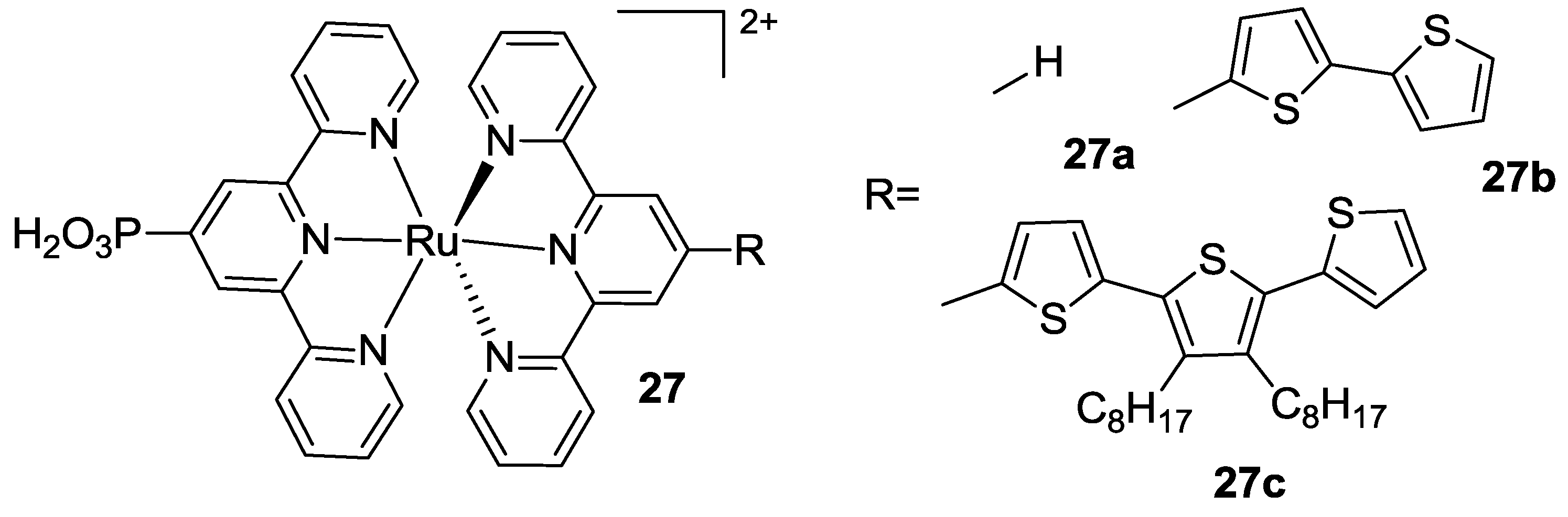 In the same year Houarner et al. [107] proposed another bis-tpy complex with a phosphonic acid as the anchoring group on one terpyridine and oligothiophene moieties on the other one, in order to increase the interaction between dye and hole transporting material (27, Figure 21). Low performances of this class were attributed to an undesired localisation of the LUMO orbital on thiophenes and, as a consequence, to a difficult charge injection into the TiO2. In order to improve the performances, the same group in 2007 introduced an unconjugated bridge between the tpy and the polythiophene moiety [108].