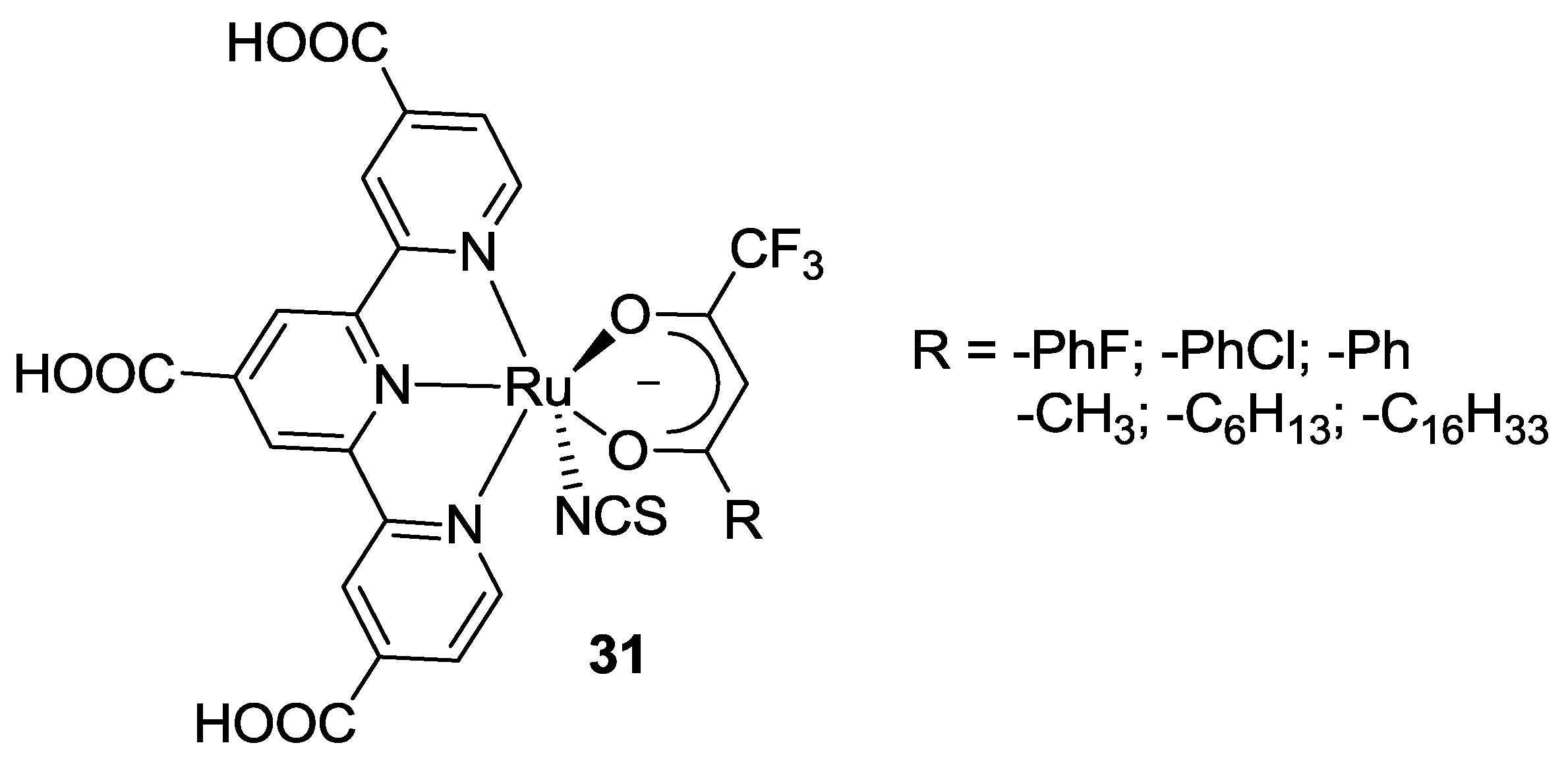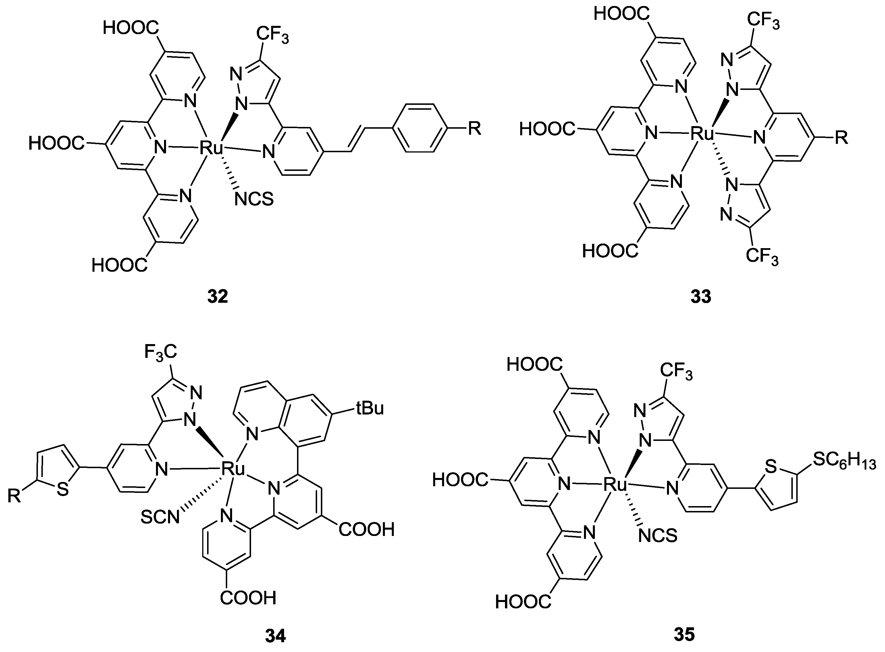 In this section, tpy based ruthenium complexes bearing three thiocyanates as ancillary ligands will be reviewed, outlining structural modifications on tpy ligand and their effects on DSCs performances.