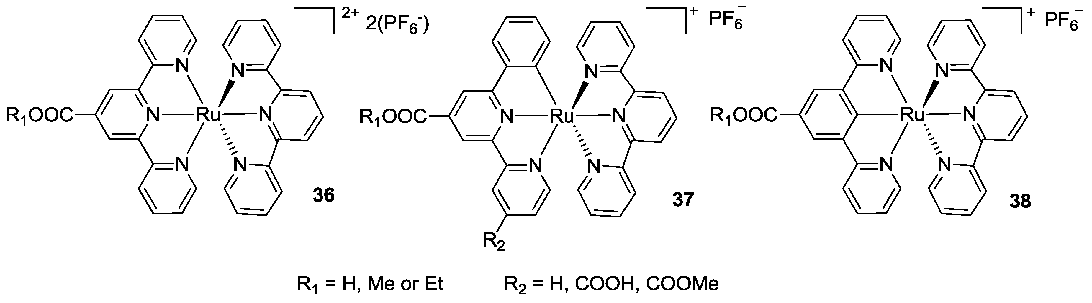 Ancillary ligand exchange was pioneered in 1997 by Zakeeruddin et al. [25] who substituted two of the three thiocyanates with a 4,4’-dimethyl-2,2’-bipyridine. In this case, the tpy ligand was not represented by tctpy, but by a simpler tpy with a phosphonic acid anchoring group (Figure 14).