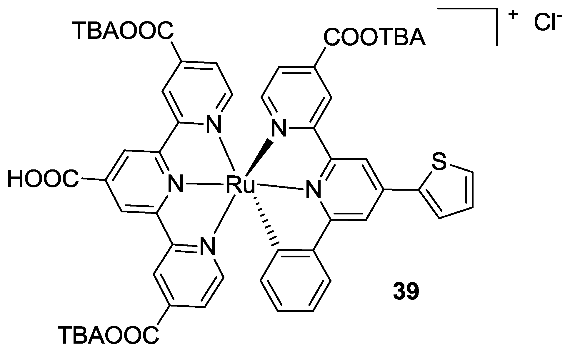 With the aim to further improve BD performance, several modifications have been carried out concerning each component of the complex. In order to increase the molar extinction coefficient and other features ruthenium was substituted with other metals; thiocyanates were replaced with different pinchers in order to obtain cyclometalated or heteroleptic complexes; and the terpyridine ligand was substituted with a quatertpyridine in order to extend the π-conjugation.