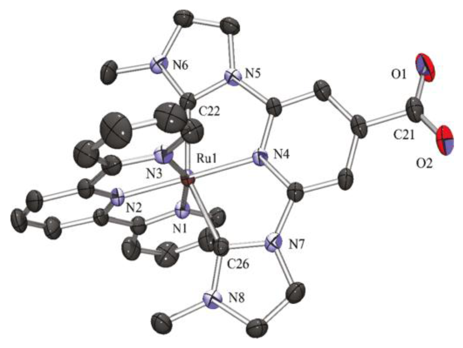 - Park, H.-J.; Kim, K.H.; Choi, S.Y.; Kim, H.-M.; Lee, W.I.; Kang, Y.K.; Chung, Y.K. Unsymmetric Ru(II) Complexes with N-Heterocyclic Carbene and/or Terpyridine Ligands: Synthesis, Characterization, Ground- and Excited-State Electronic Structures and Their Application for DSSC Sensitizers. Inorg. Chem. 2010, 49, 7340–7352. [Google Scholar] [CrossRef] [PubMed]