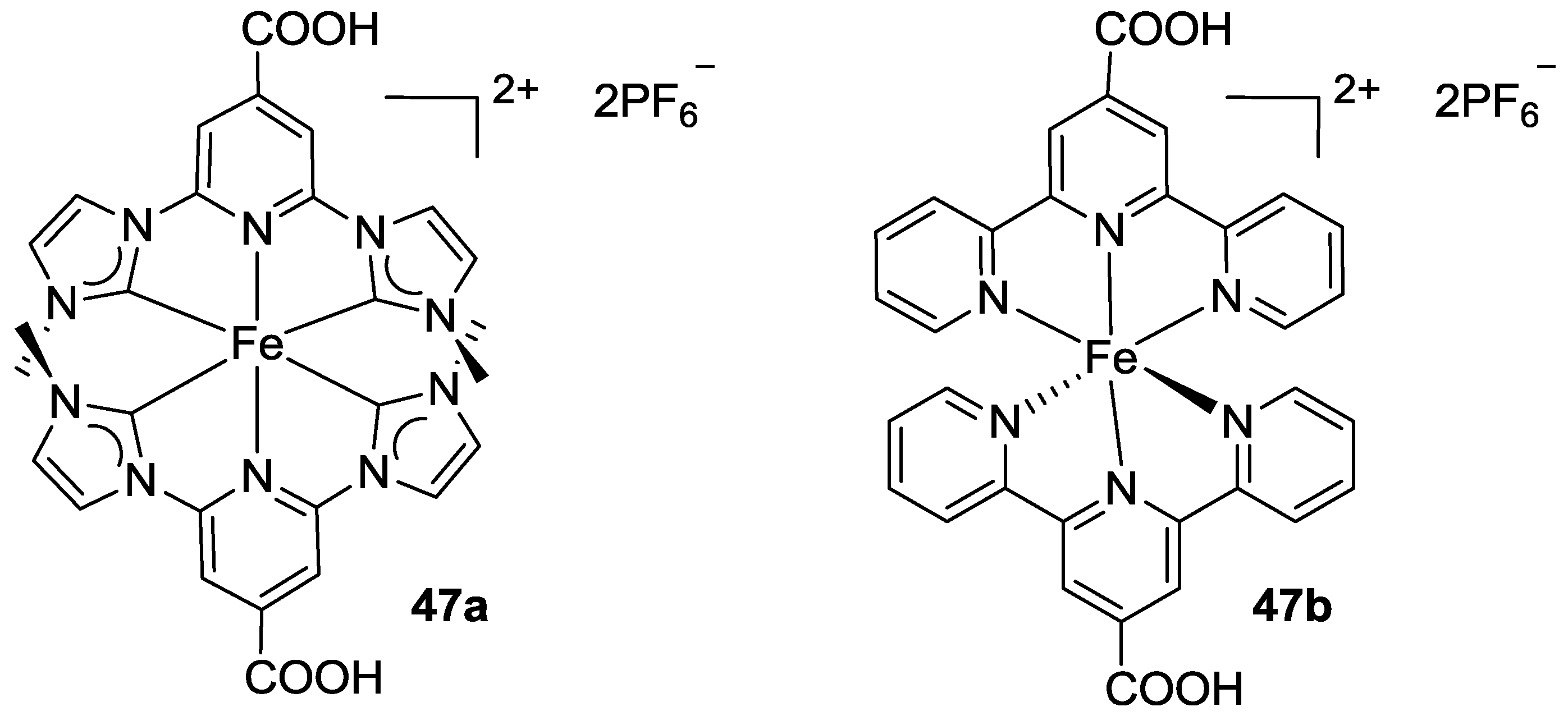 Funaki et al. [72] proposed a similar substitution, in which phenylene ethylene moieties (3a in Figure 5) were introduced between the COOH functionality and the tpy core, obtaining a better charge injection (12.8 mA/cm2) with respect to dye 2 (6.1 mA/cm2), even if a thicker TiO2 (36 μm vs. 10 μm) and higher light intensity (100 mW/cm-2 vs. 78 mW/cm-2) were used. The injection efficiency proved to be lower with respect to BD (16.7 mA/cm2), tested in the same conditions. Moreover, when the spacer was represented by two phenylene ethynylene units (3b in Figure 4) a higher molar extinction coefficient and slight bathochromic shift were obtained, but a significantly lower Jsc value was observed (5.7 mA/cm2) which was ascribed to an increased dye aggregation.