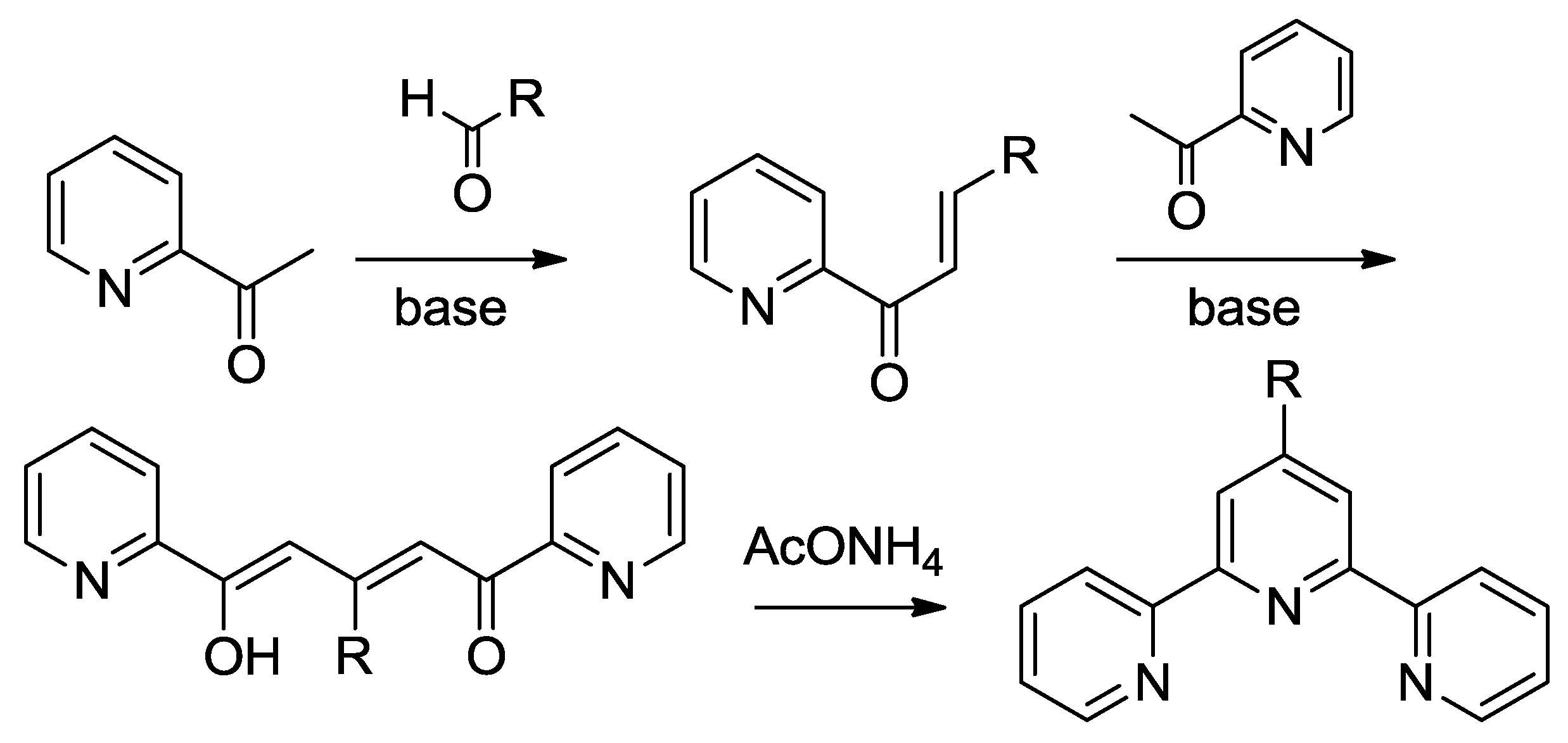The first route has been formerly reviewed in 1976 by Kröhnke [50], who reported the synthesis of α,β-unsaturated ketones from 2-acetyl derivatives of pyridine and aldehydes. Then, the intermediate reacts with another 2-acetylpyridine to form a 1,5-diketone that can undergo cyclization to pyridine thanks to ammonia sources such as AcONH4 (Scheme 2). A series of modifications to this procedure has been proposed in order to increase yields or improve the synthetic pathway sustainability [28,51].