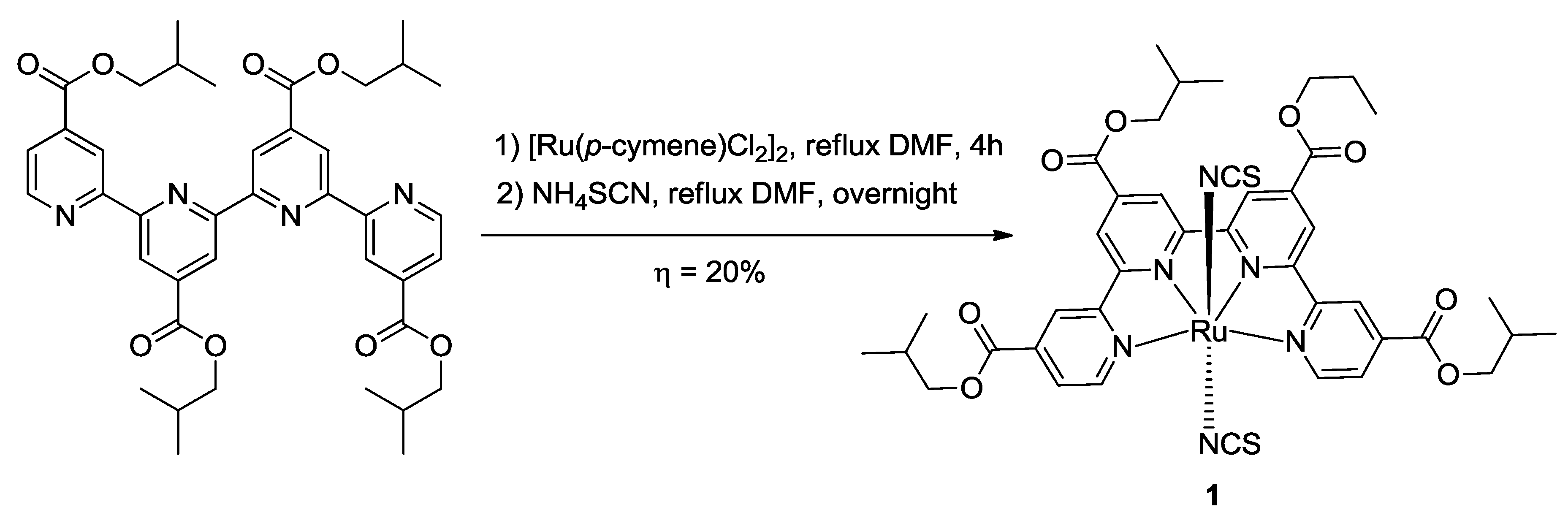 Noteworthy, the synthetic pathway used to achieve 4,4’,4’’-tricarboxy-2’,6’-terpyridine (tctpy) for Black Dye [54] involves the formation of the terpyridine core starting from 4-ethyl pyridine refluxed with Pd/C over nine days. This procedure was further improved by Dehaudt et al. [55]. Among the other possible strategies to obtain a tpy core, it is worth noting an inverse Diels-Alder reaction on 1,2,4-triazine that uses 2,5-norbornadiene as dienophile [56].