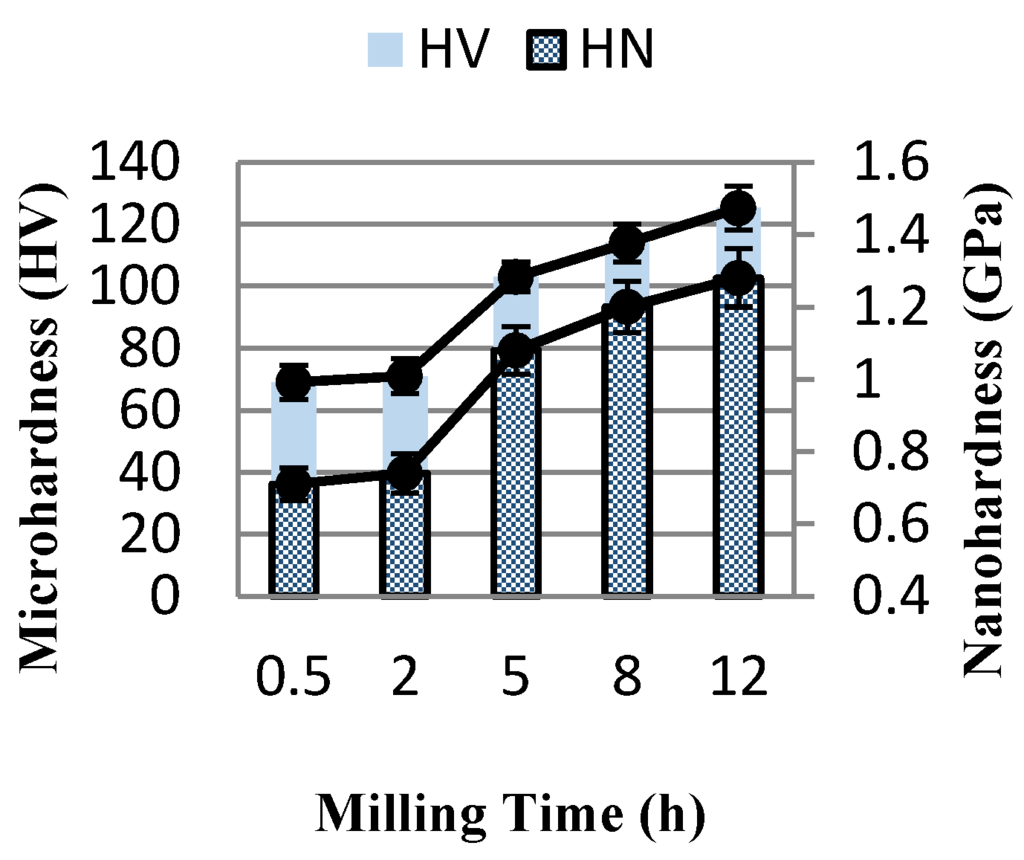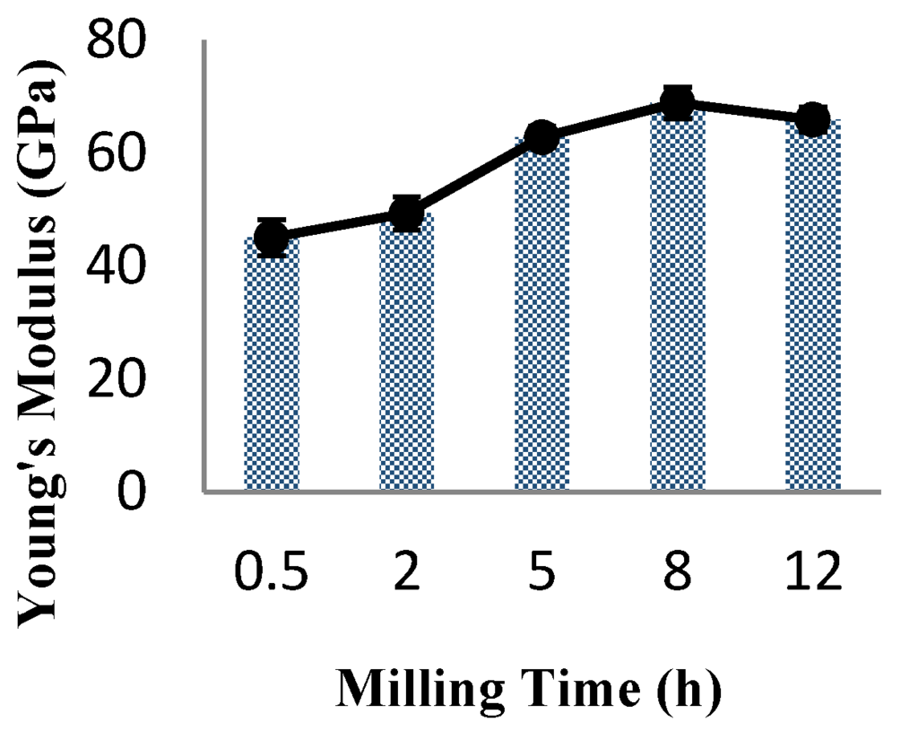 | Composite | Milling Time (h) | Micro Hardness (HV) | Nano Hardness (GPa) | Young’s Modulus (GPa) |