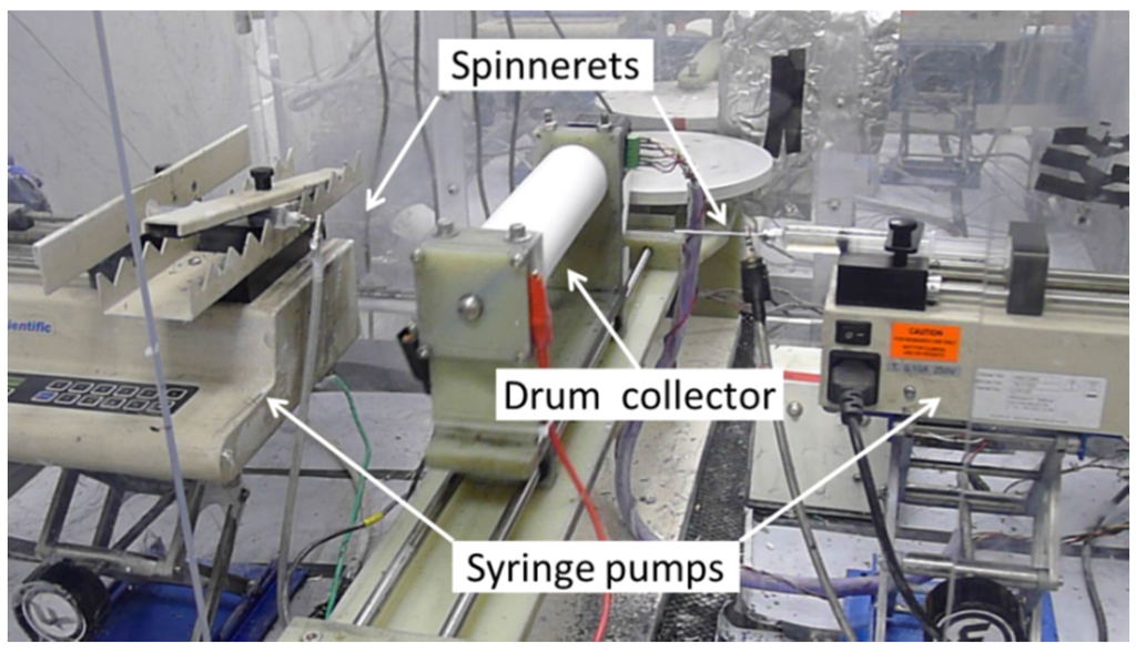 Schematic of the dual fiber electrospinning setup used in the present study.