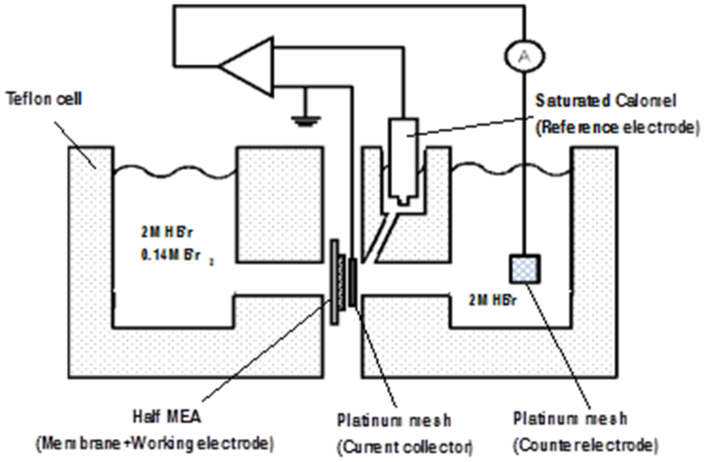 The operation of a regenerative H2/Br2 fuel cell is quite simple. During charging, hydrobromic acid (HBr) is electrolyzed to hydrogen (H2) and bromine (Br2) using electrical energy. These products are stored in external tanks until electricity is needed. During discharging, the stored products, H2 and Br2, are reacted in the fuel cell to produce HBr and electricity. The membrane-electrode assembly (MEA), a key component of the fuel cell, is composed of a polymeric proton-conducting membrane, typically selected from the perfluorosulfonic acid (PFSA) family, which physically separates the hydrogen electrode and the bromine electrode. The membrane prevents electrical shorting while providing pathways for inter-electrode proton transport and minimizing unwanted Br2 and Br3- crossover.