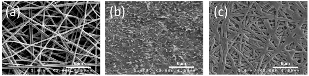 Electrospun mats and freeze-fractured membrane cross sections were imaged with a Hitachi S-4200 scanning electron microscope (Hitachi, Hitachinaka, Japan). The dry membrane samples were manually fractured after cooling in liquid nitrogen. The resultant micrographs were analyzed using ImageJ (version 1.38e) [23].