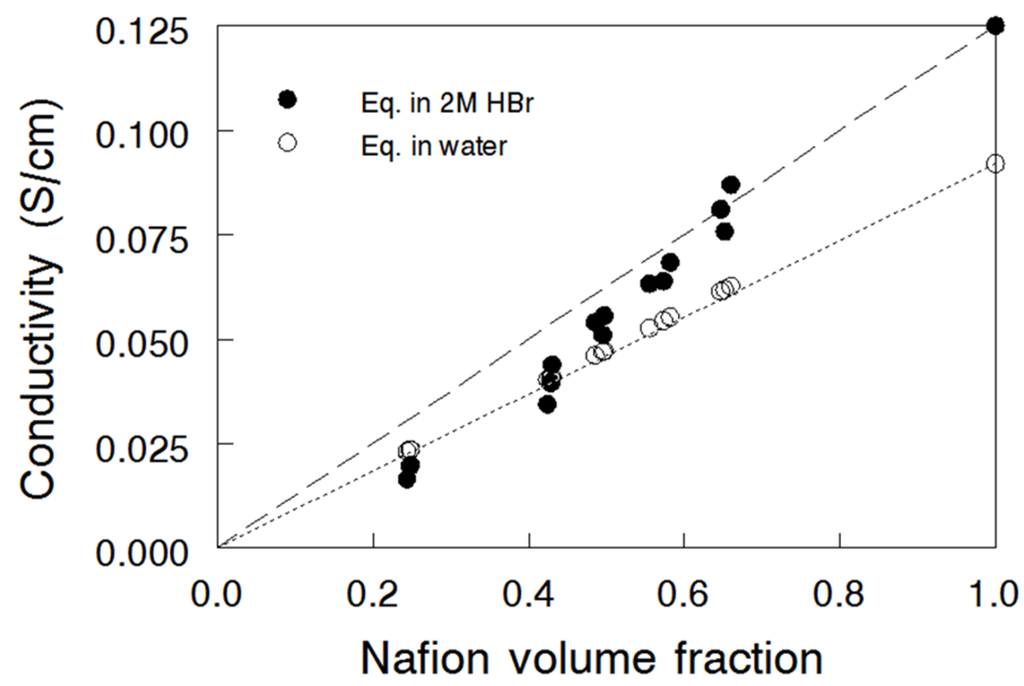 In-plane ionic conductivity of Nafion nanofiber composite membranes as a function of Nafion volume fraction at 25 °C (○) N(fibers)/PPSU measured in water; (●) N (fibers)/PPSU measured in 2 M HBr. The conductivity of Nafion® 115 in water and in 2 M HBr is 0.084 S/cm and 0.107 S/cm, respectively.