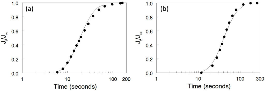 A typical fit of Jt/J∞ experimental data to the theoretical breakthrough curve is shown in Figure 5a for a Nafion® 115 membrane [28]; only the first eight data points were fitted to maintain the accuracy of the approximation provided by the first term of the Laplace transform solution to the Fick’s equation (Equation (9)) [24]. Based on the fitted curve, the Br2/Br3- diffusion coefficient was calculated equal to 1.45 × 10−6 cm2/s, as reported earlier [28]. Similar transient curve experiments were performed with selected electrospun membranes. As an example, the fit of experimental vs. time data to the theoretically predicted breakthrough curve is shown in Figure 5b for the 57 vol% N (fibers)/PPSU membrane. The resultant diffusion coefficient of bromine species (Br2/Br3-) in the composite membrane was 7.79 × 10−8 cm2/s, significantly lower than the value of 1.45 × 10-6 cm2/s for Nafion® 115.