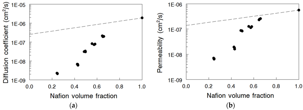 The experimentally determined steady-state Br2/Br3- membrane permeability is plotted as a function of Nafion volume fraction in Figure 6b. As expected, the permeability decreased with increasing content of the uncharged polymer following the same trend as the Br2/Br3- diffusion coefficient. The decrease is most likely related to an increase in tortuosity and decrease of the cross-sectional area for diffusion, along with the concurrent swelling reduction, all of which contributed to improvement in membrane’s Br2/Br3- barrier properties. It was noted that both the diffusion coefficient and permeability were lower for Nafion 115 membrane compared to those values for membrane from electrospun and densified Nafion (without PPSU). This could indicate either a reduced level of crystallinity or the presence of some residual porosity in the processed electrospun films, where the latter could have occurred during extraction of the PEO carrier polymer.