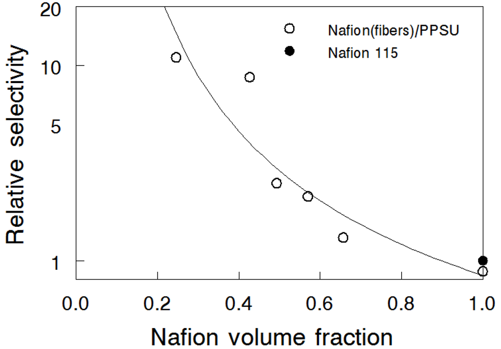 Relative, with respect to Nafion 115, selectivity of the nanofiber composite membranes as a function of Nafion volume fractions at 25 °C. (○) N(fibers)/PPSU; (●) Nafion® 115.