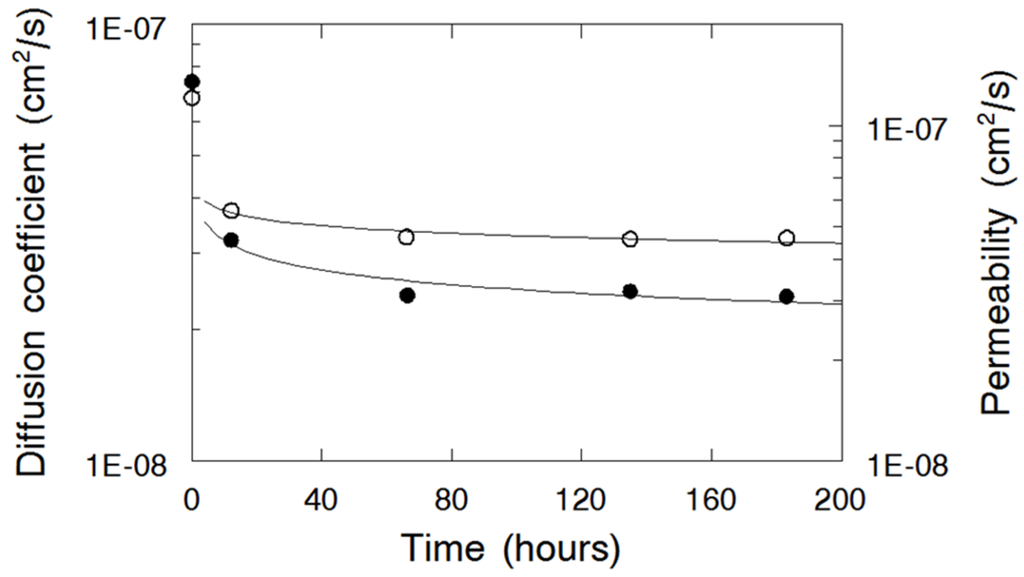 Membrane chemical stability was evaluated by measuring ion conductivity, diffusion coefficient, and steady-state permeability of membranes immersed in 0.14 M Br2 in 2 M HBr at 25 °C for 12, 66, 135, and 183 hours. These tests were performed with a 55 vol% N (fibers)/PPSU membrane. It was found that the ionic conductivity remained constant at 0.058 S/cm during this soaking test, which indicated that –SO3H ion exchange groups bonded to the carbon-fluorine side chains of Nafion were stable in a bromine environment [31]. As seen in Figure 8, the diffusion coefficient and the steady-state permeability for the membrane decreased after 12 h and then stabilized at 2.40 × 10−8 cm2/s and 4.60 × 10−8 cm2/s respectively, which might indicate some kind of short-term structural rearrangement (densification) and/or chemical reaction between bromine and PPSU. In addition, no irreversible color change of the membranes was observed.