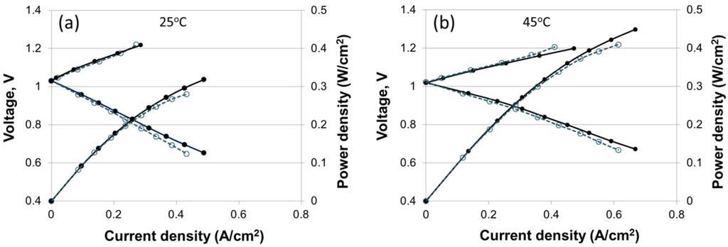 The H2-Br2 regenerative fuel cell experiments (charging and discharging) were performed at 25 °C and 45 °C with an electrospun dual fiber 55 vol% N (fibers)/PPSU nanofiber composite membrane and with Nafion 115, which served as a reference. The resultant current–voltage curves are shown in Figure 10. The first thing that can be noticed is the absence, in the discharge curves, of a vertical drop in the cell voltage at low current density as observed in a typical H2/O2 fuel cell. This is the result of fast kinetics at both the negative (H2) and the positive (Br2) electrode. The kinetic losses contribute only a small fraction of the overall voltage loss in a H2/Br2 fuel cell, which is in contrast to the significant losses at the O2 electrode due to the sluggish ORR kinetics. Therefore, in H2/Br2 fuel cell, the performance is limited mainly by the ohmic resistance in the system (predominantly membrane) and bromine species crossover [32].
