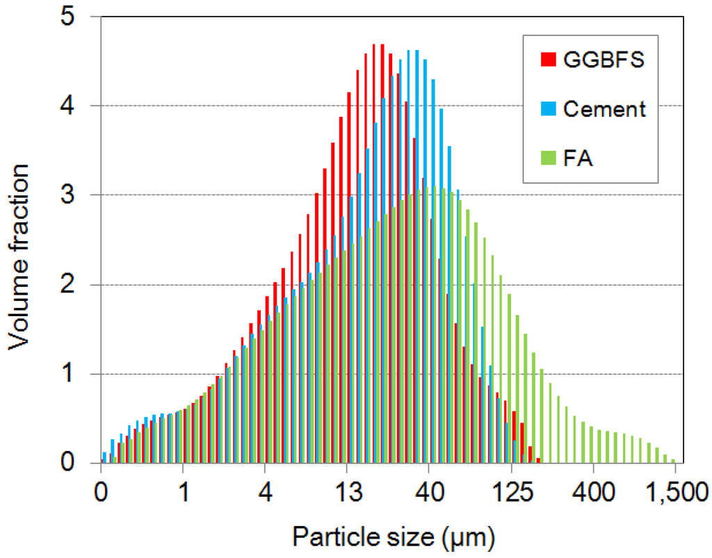 Measured particle size distribution of cement, ground granulated blast-furnace slag (GGBFS), and fly ash (FA).