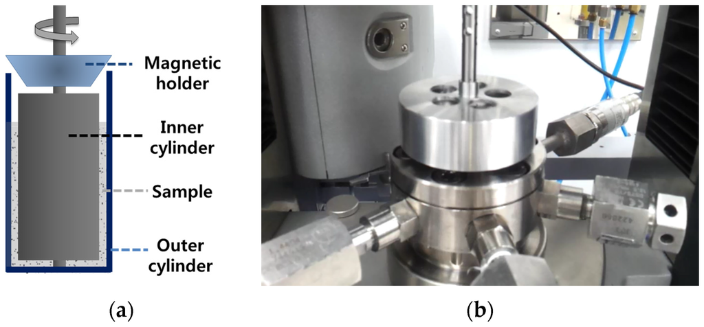 A rheometer was fabricated to measure the rheological properties under high hydrostatic pressure. Figure 2 shows the schematic of the fabricated high-pressure cell, and the setup launched in the rheometer. Geometrically of the rheometer is a modified concentric cylinder, conventionally used for the rheological measurements. The gap size between the inner and outer cylinders is 2 mm, which is larger than the maximum size of the cement particles. The diameters of the inner and outer cylinders are 35 and 39 mm, respectively. The two cylinders were sealed using bolts, and then a high pressure was generated by filling the inner space with paraffin oil using a hand pump. The time used to apply the high pressure was approximately 15 min. The inner cylinder was then rotated to create a Couette flow in the samples, where the driving torque was transferred by a magnetic holder.