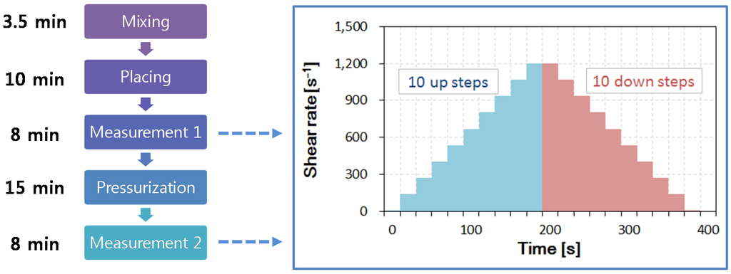 For each mixture, a 50 mL sample was produced. Each was mixed according to the following procedure to produce fresh-state samples: (1) hand-mixing for 0.5 min; (2) scraping the mixer for 2.5 min; and (3) hand-mixing again for 0.5 min. An additional 10 min was required to load the sample in a high-pressure rheometer. Finally, rheological measurements began at 13.5 min after the mixing was initiated. Room temperature (22 °C) and a relative humidity of 50% were maintained during the mixing and experiments.