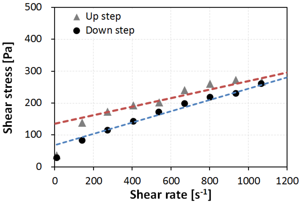 where is the measured shear stress and is the applied rate of shear strain. In Figure 5, it is easily seen that the first point at 10 s−1 deviates from the linear trend. A previous study [16] reported that the first measured point usually included (1) transient fluctuations on the shearing of non-Newtonian fluids, which are systematic errors caused by the measuring geometry; and (2) thixotropic effects caused by the inherent characteristics of the sample material. Both are relevant to the experimental errors plausible in this investigation. Accordingly, excluding the first measured point for the model fitting allows a coefficient of determination of R2 > 0.95 for all samples.