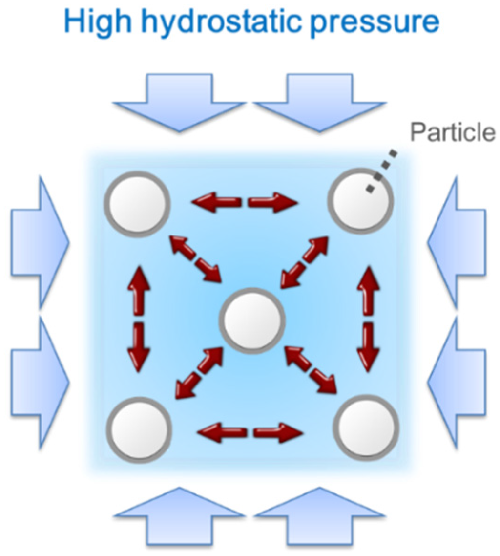 On the other hand, the Krieger-Dougherty equation considers the interaction of particles in a very dense suspension [17], while the classical Einstein equation assumes there is no interaction of spherical particles in a diluted suspension (in which the solid volume fraction is below 10%). The particle interaction is described by the two parameters of packing density and the intrinsic viscosity of the particles. The intrinsic viscosity is approximately 6.0 for cement paste [18], and this value decreases by the incorporation of admixtures to reduce the viscosity. The hydrostatic pressure does not affect the drag force of a single particle; consequently, the flow resistance (intrinsic viscosity) of single particles is unchanged by high hydrostatic pressures. The packing state of the particles usually explains the change of a suspension’s microstructure under a certain intensity of shearing [19]. For example, a shear-thinning suspension is expected to have higher packing density at higher shear rates. The maximum packing density is close to 0.74, in which mono-sized spheres construct face-centered cubes. The density decreases with lower shearing rates. Therefore, a suspension shows a constant viscosity at all rates of shear strain only if the suspension has a consistent microstructure (and furthermore the packing density of particles) regardless of the intensity of shearing. The samples under high pressure showed a constant viscosity in which the applied shear stress exceeded the yield stress (high similarity to the Bingham fluid model), which indicates an increase in the packing stability of the cement particles. The high hydrostatic pressure in the interstitial fluid drives a repulsive force among the jammed particles. Figure 6 shows the state of repelling particles under high hydrostatic pressure. The particle interaction is consequently minimized at high pressure. In contrast, under atmospheric pressure, attraction prevails among the cement particles with the same interparticle distance. Cement agglomeration is dominant in this state [20].