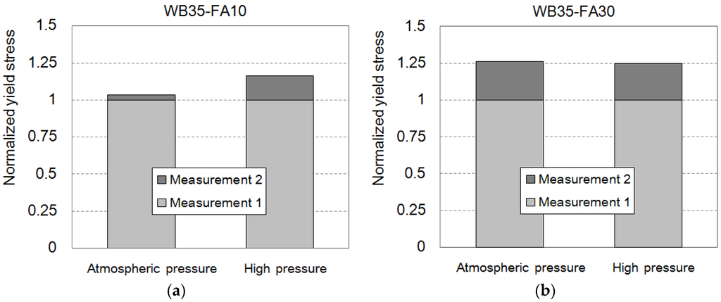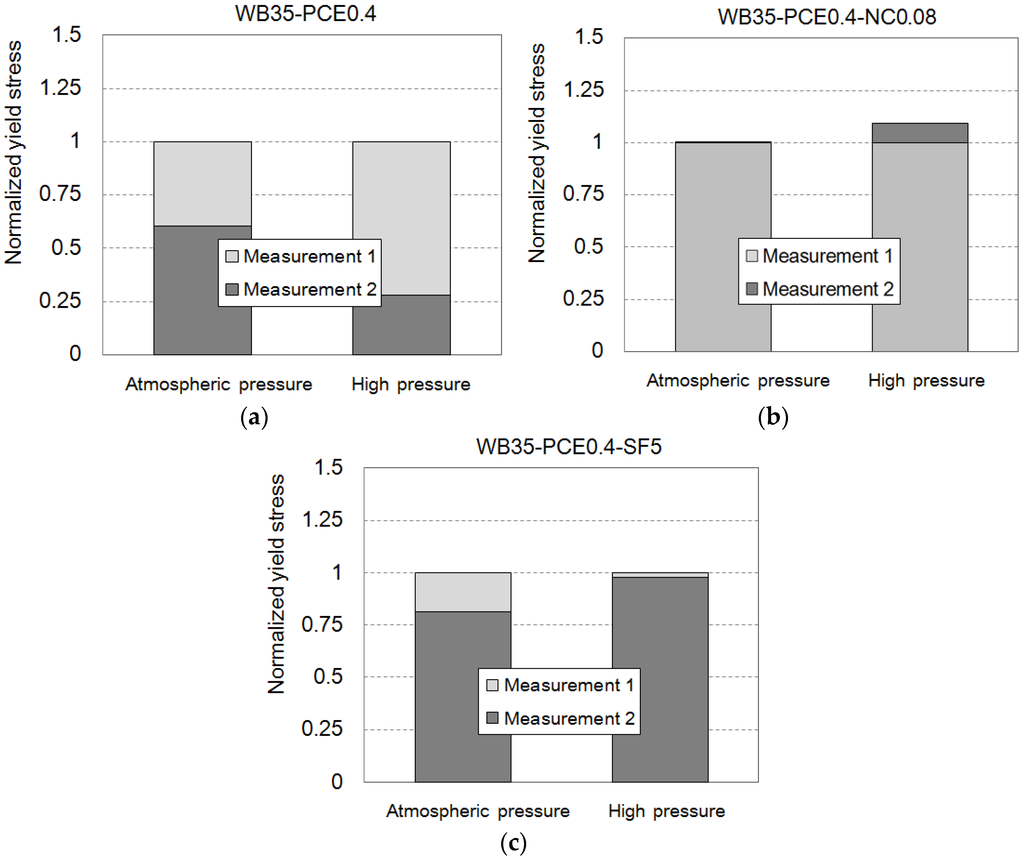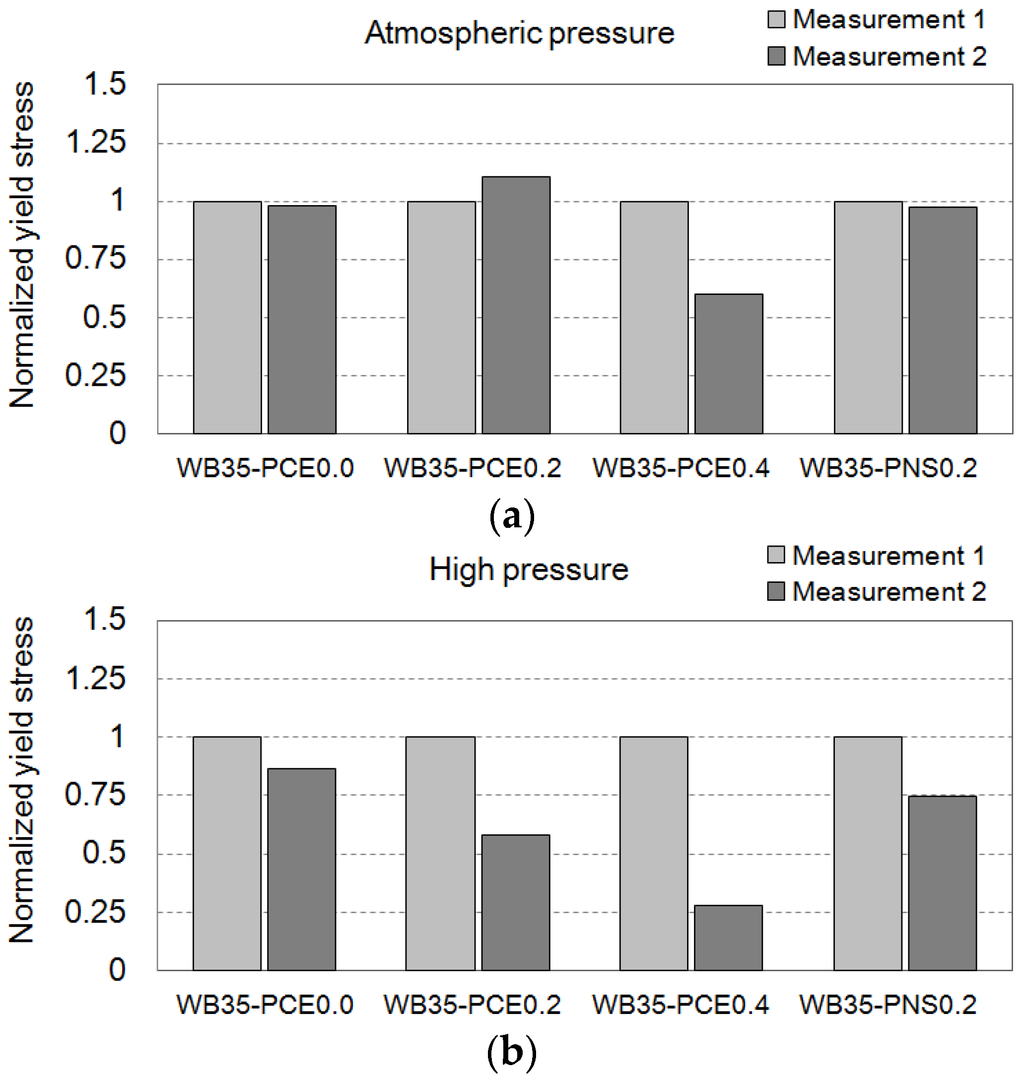 To understand the effect of chemical admixtures on the rheology of the cement pastes, comparative analyses of the obtained yield stresses were performed, as shown in Figure 7. The yield stresses are normalized according to the yield stress of Measurement 1 for each experiment. For example, replicated samples of WB35-PCE0.0 were measured twice: (1) Measurements 1 and 2 under atmospheric pressure; and (2) Measurement 1 under atmospheric pressure and Measurement 2 under high pressure. The result of Measurement 1 for each experiment was used as a control, and shows a variation within ±13 Pa, based on the average value of 116 Pa. Although this is an acceptable variation, considering the reproducibility of the rheological test of the cement pastes [16], the variation causes difficulties in establishing simple comparisons. In the bar charts of the normalized yield stresses, Measurements 1 and 2 can be intuitively compared according to the presence of high pressure. Under continuous atmospheric pressure, in Figure 7a, the differences between Measurements 1 and 2 are only the results of the 15 min delay in pressurizing the rheometer. This short delay in the pressurization hardly affects the yield stresses of the cement pastes. The effect of high pressure on the same sample ages can be seen in the second bar chart, Figure 7b.