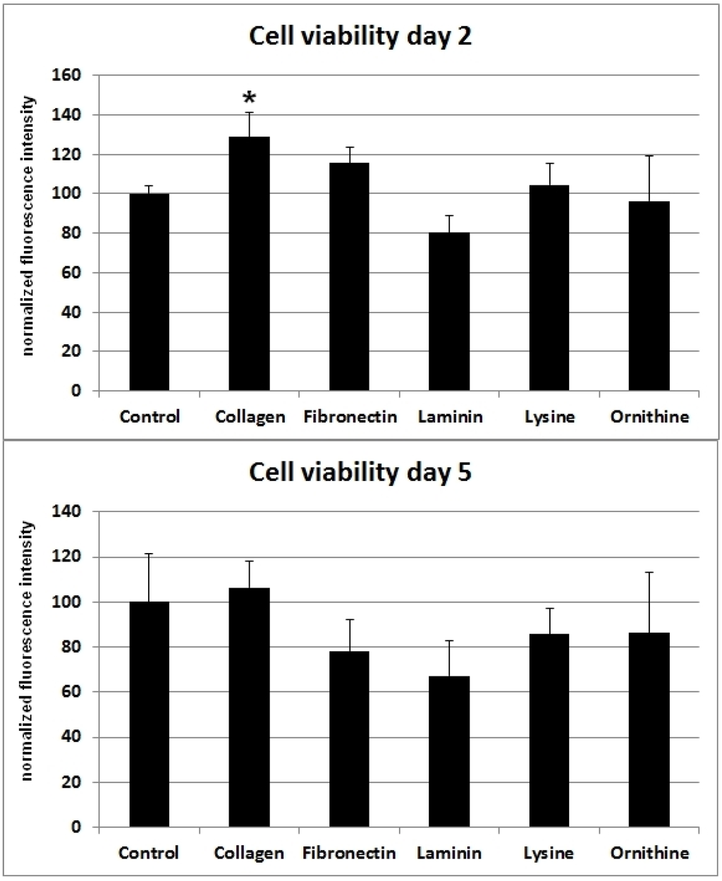 Different ECMs and corresponding cell viability of SCs after two and five days. Ordinate indicates viability as percentage values of fluorescence intensity in relation to day of seeding. Viability was assessed using a resazurin assay. Significant (*: p < 0.05) results are in comparison to the control.