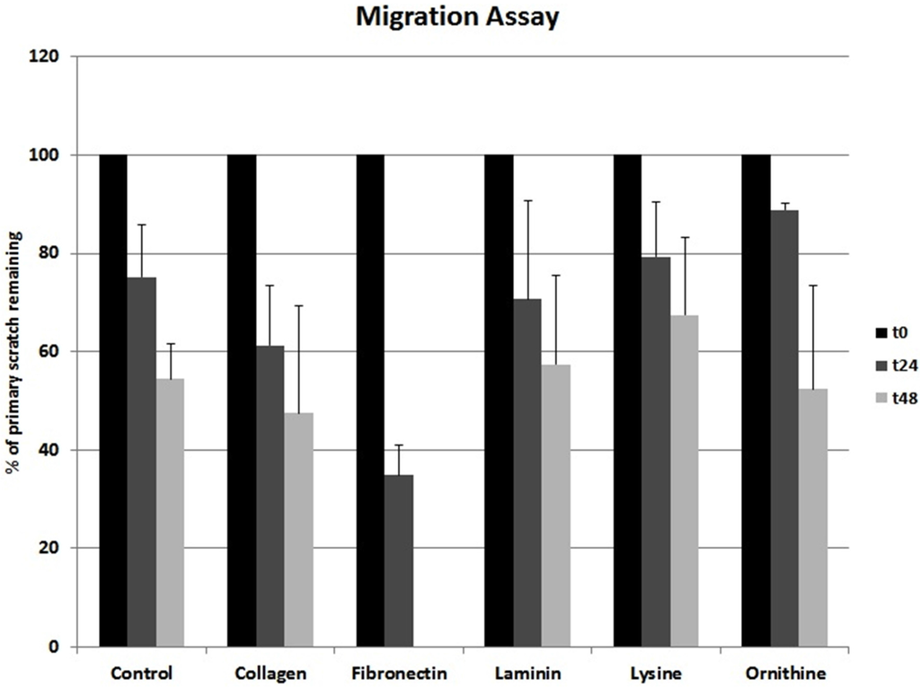 Different ECMs and corresponding SC migration. Ordinate indicates remaining cell-free area as percentage values upon the day of creating the scratch.