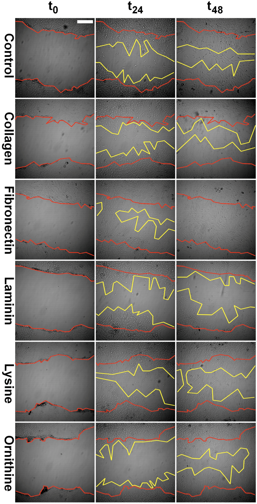 Representative images of scratches in the confluent SC monolayer at day zero (t0), as well as at 24 h (t24) and 48 h (t48) intervals. Scratch margins are marked in red and yellow color for t0 and t48, respectively. Scale bar indicates 100 µm.