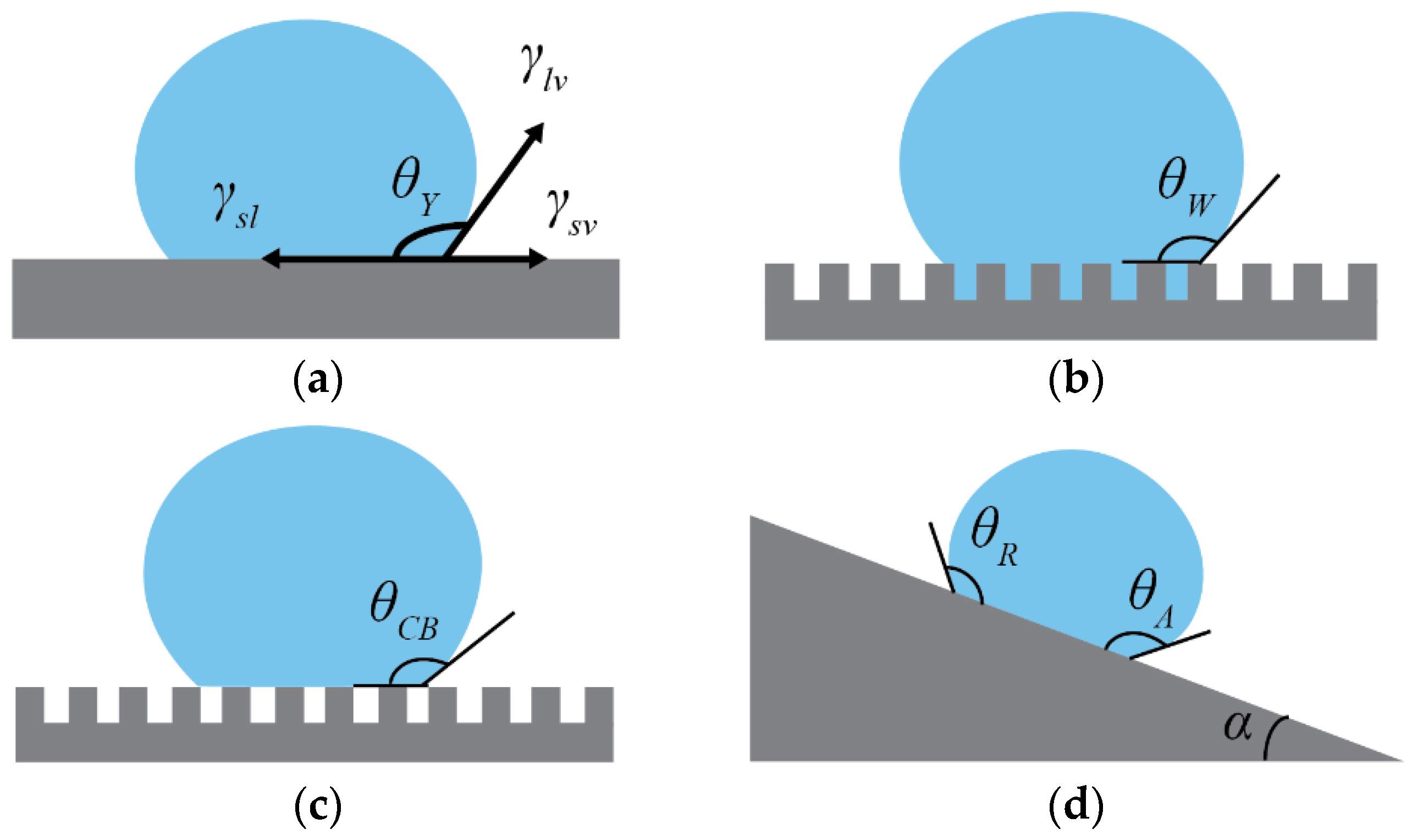 (a) Young’s equation; (b) Wenzel state; (c) Cassie–Baxter state; (d) water droplet on an incline, showing advancing and receding contact angle and sliding angle.