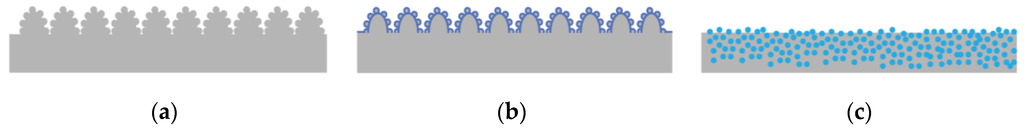 Superhydrophobic surfaces made by electrodeposition can be classified into three main categories, as shown in Figure 3 and Table 1. Superhydrophobicity is achieved by: (a) surface roughness alone; (b) surface roughness and surface chemical modification with low surface energy material; and (c) co-deposition of hydrophobic particles with a metal matrix. Cross-sectional views of the three types of electrodeposits are shown in Figure 3. It should be noted that there has also been significant work on co-depositing hydrophobic particles by the electroless deposition process (e.g., [35,36,37,38,39]). However, these studies will not be included in this review, because the electroless deposition process is quite different.