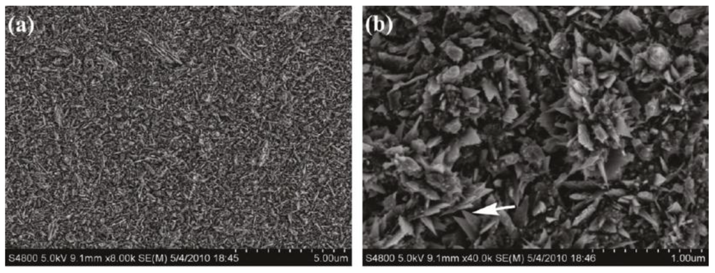 Superhydrophobic Ni films with different surface morphologies were also produced using an ionic electrolyte with varying plating waveforms. As reported by Gu and Tu [42], the ionic electrolyte was a deep eutectic solvent composed of choline chloride, ethylene glycol and nickel chloride. Compared to aqueous electrolyte, ionic electrolyte has a very low vapor pressure and high thermal stability, which allow for greater control options during the synthesis process [42]. In this study, the electrodeposition process was carried out at 90 °C with three different voltage waveforms: constant voltage (CV), pulse voltage (PV) and reverse pulse voltage (RPV). Each voltage waveform resulted in different surface morphologies and roughness of the Ni film. In the CV mode, the surface of the Ni film consisted of nanosheets, as shown in Figure 4. When the voltage waveform was PV, aligned nanostrips were formed. A hierarchical flower-like structure was the resulting morphology from the RPV mode. The Ni films produced by the three voltage waveform were all hydrophobic. Without any chemical modification, contact angles up to 164° and sliding angles less than 3° were reported for the Ni film with the nanosheet morphology. In addition, corrosion measurements have shown that the superhydrophobic Ni films have a lower corrosion potential than the brass substrate, making them suitable as a corrosion barrier for applications in aqueous environments.