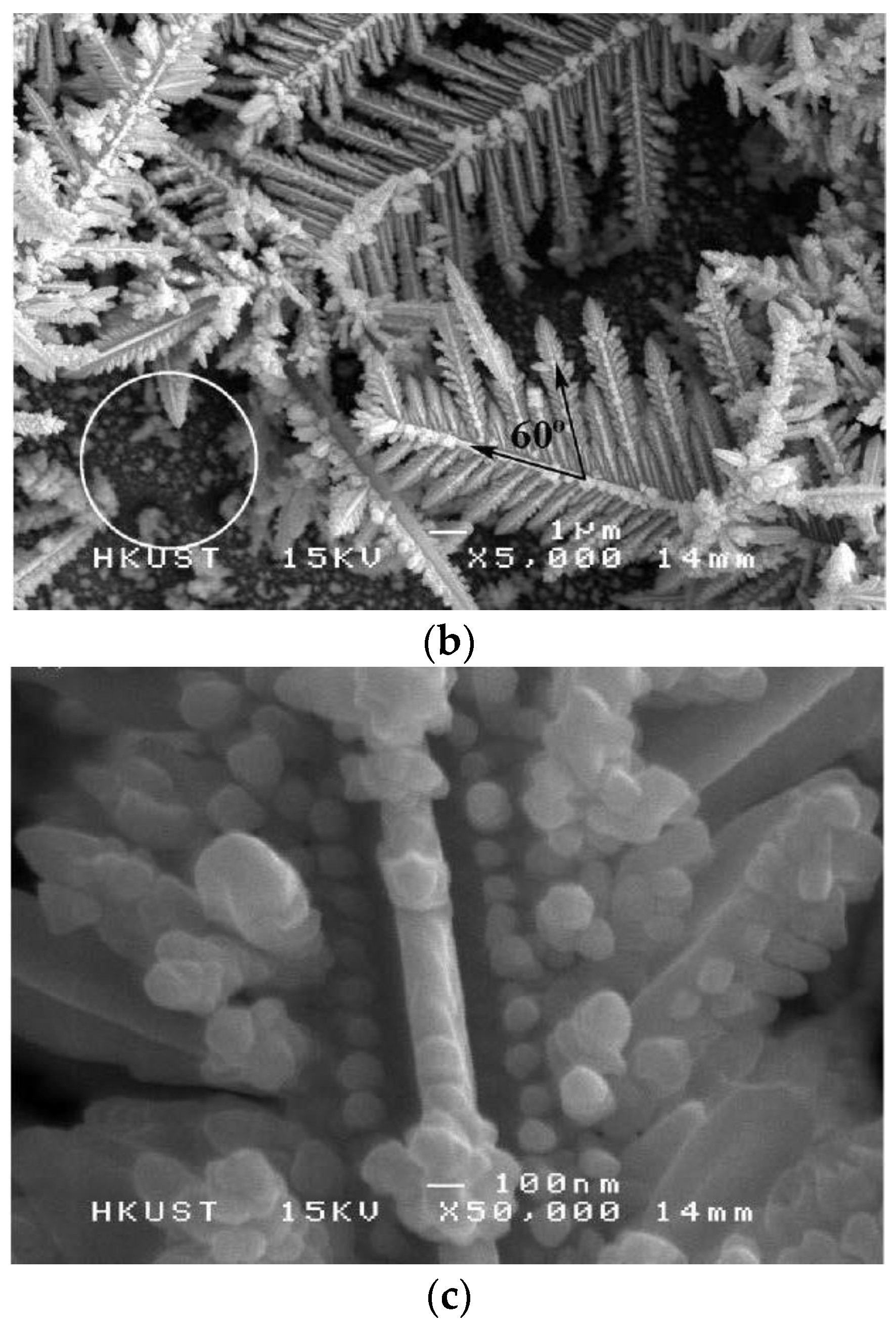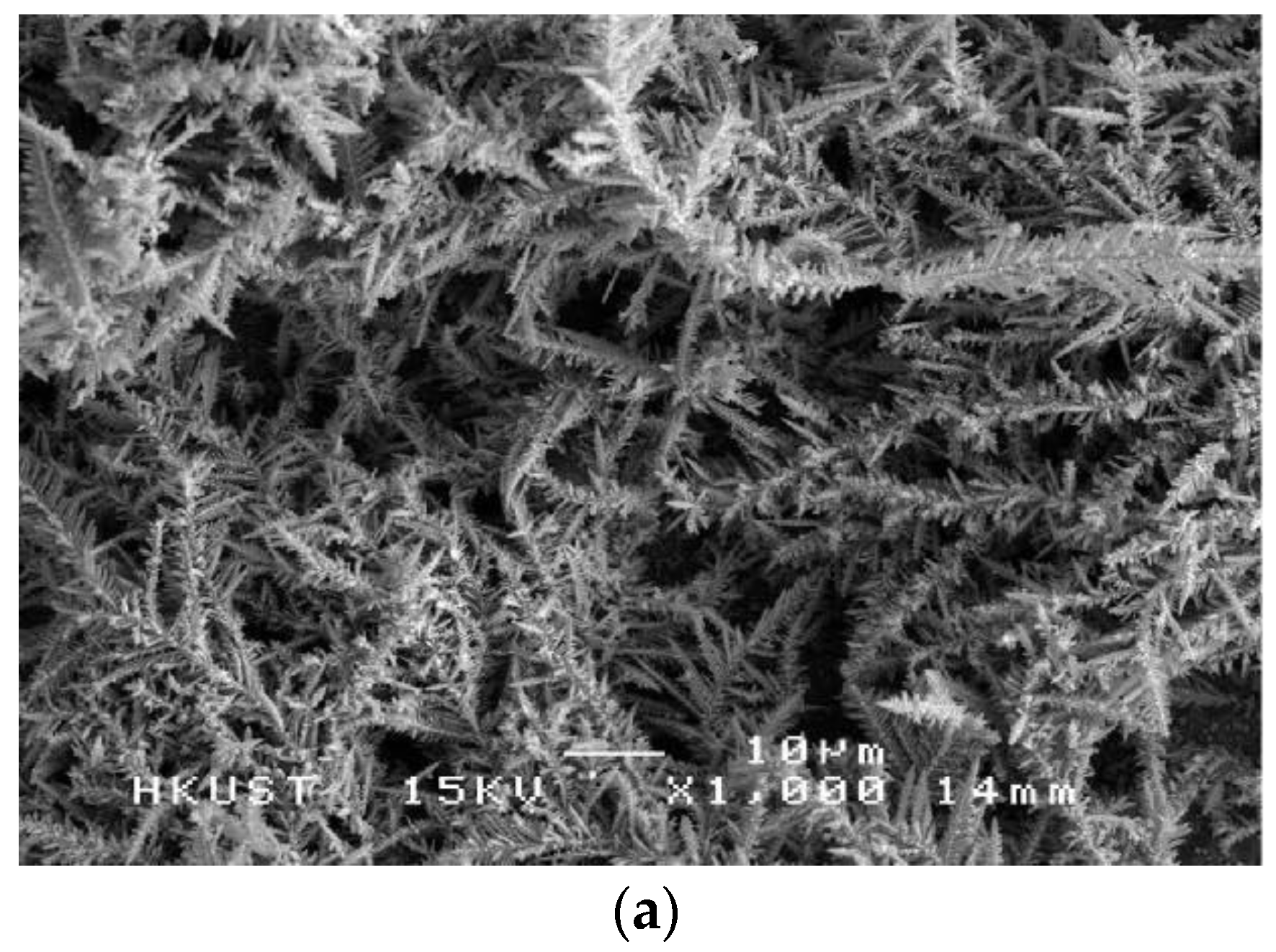 Silver surfaces with a dendritic structure were electrodeposited from an aqueous solution of silver nitrate on Ni-coated Cu substrates [68]. It was determined that the applied potential during the electrodeposition of silver had a significant influence on the surface morphology. At applied potentials between −0.4 V and −1.0 V, micron-sized Ag particles with a faceted structure were formed. When the applied potential was −2.0 V, the substrate was covered with a hierarchical structure consisting of micron-sized Ag dendrites and nanoscale Ag crystals on the branches of the dendrites, as depicted in Figure 6. After chemical modification of the dendritic Ag with n-dodecanethiol, a superhydrophobic surface with a water contact angle of 155° and a sliding angle less than 2° was obtained.