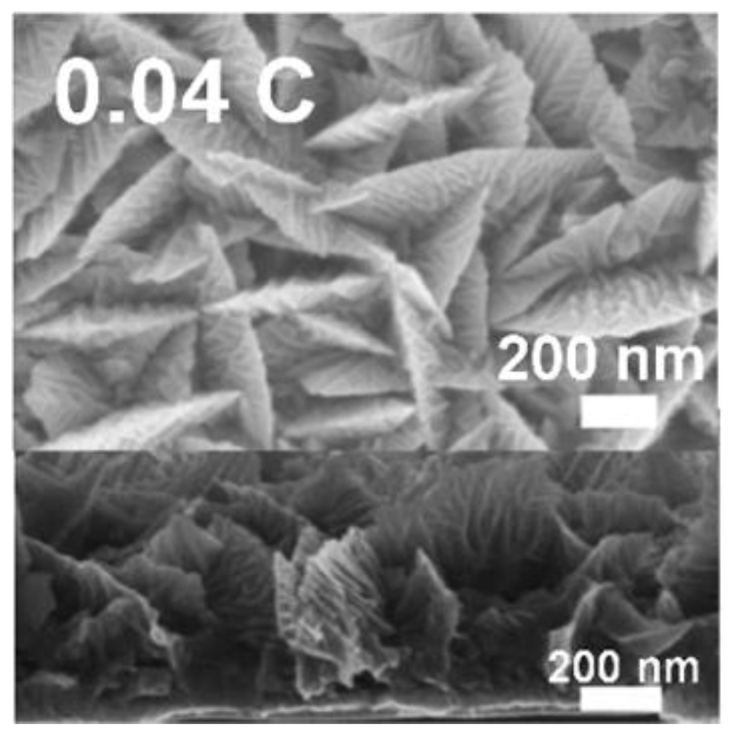 Superhydrophobic nanoflake palladium surfaces were made by electrodeposition, followed by post-deposition chemical modification with n-dodecanethiol [73]. The authors studied the effect of applied potential and deposition charge on the Pd surface morphology. With increasing applied potential changes in surface morphology were reported from spike-type structures (−0.3 to −0.15 V vs. Ag/AgCl) that grew vertically to flake-like nanostructures (0.20–0.25 V vs. Ag/AgCl). As shown in Figure 7, Pd deposited at 0.20 V vs. Ag/AgCl and a total deposition charge of 0.04 C had a flake-like structure. Before surface treatment with n-dodecanethiol, the water contact angle of the nanoflake Pd surfaces was 60°. After the treatment, water contact angles up to 161° and a sliding angle as low as 3° were observed for a deposition charge of 0.04 C.