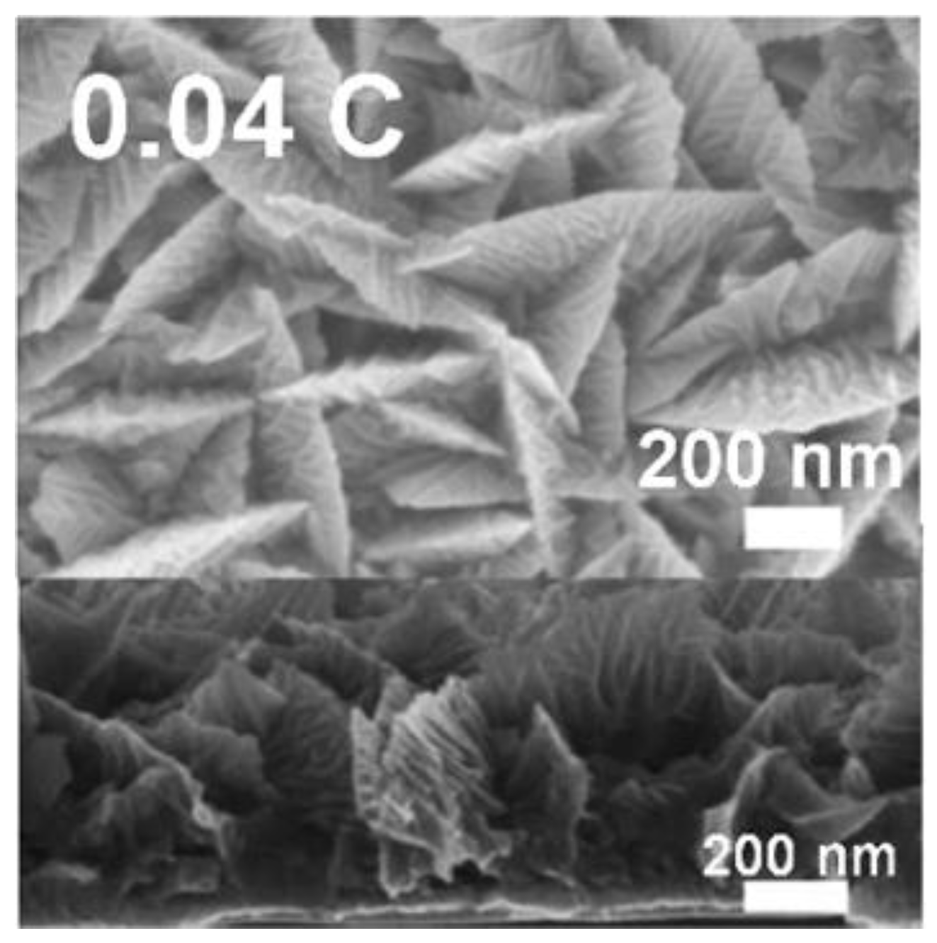 Planar (top) and cross-section (lower) images of the Pd flake structure produced at 0.20 V vs. Ag/AgCl and a deposition charge of 0.04 C. Reprinted (adapted) with permission from [73]. Copyright 2015, American Chemical Society.