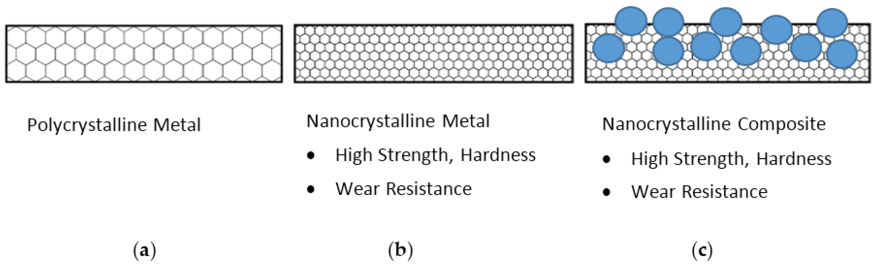 We are currently working towards a potential solution to this problem, which is based on the composite coating approach similar to the one described in Section 3.3 that produces a metallic coating with embedded hydrophobic particles throughout its entire thickness, as shown in Figure 3. The concept of this approach is as follows (Figure 8). First, refine the crystal size of the metal matrix from conventional polycrystalline (Figure 8a) to the nanocrystalline range (Figure 8b). By refining the crystal size, electrodeposited metals follow the Hall–Petch relationship of increasing strength σy and hardness H with decreasing grain size according to the following equations,