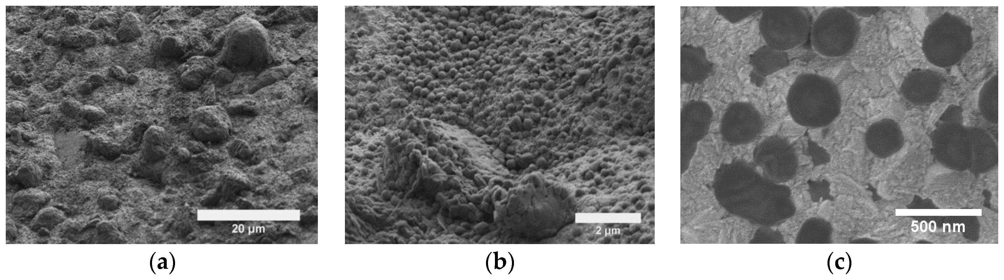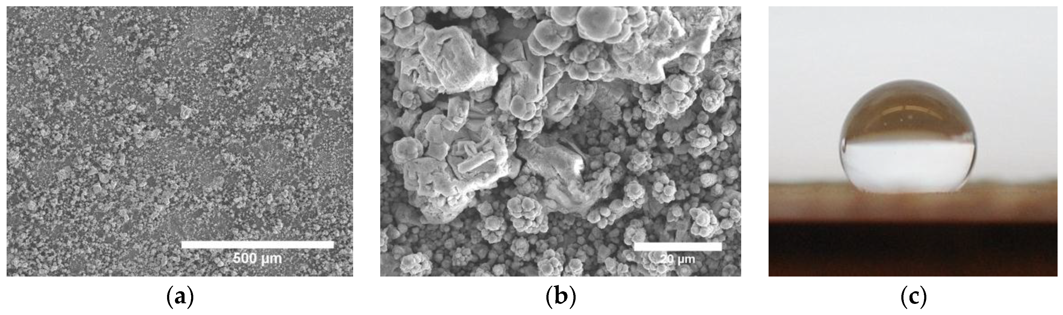 Electrodeposition of zinc can produce surfaces with spongy, fractal and nanorod morphologies [63,64,65]. Zhang et al. [63] produced zinc with a hierarchical spongy morphology by electrodeposition from ionic liquid. The formation of the spongy structure was due to the use of thiourea in the electrolyte. The thiourea molecules are adsorbed on the cathode and regulate the diffusion of zinc ions, causing a three-dimensional structure to form instead of a smooth film. After electrodeposition, the surface was immersed in a polypropylene solution to achieve a very high water contact angle of 170°.