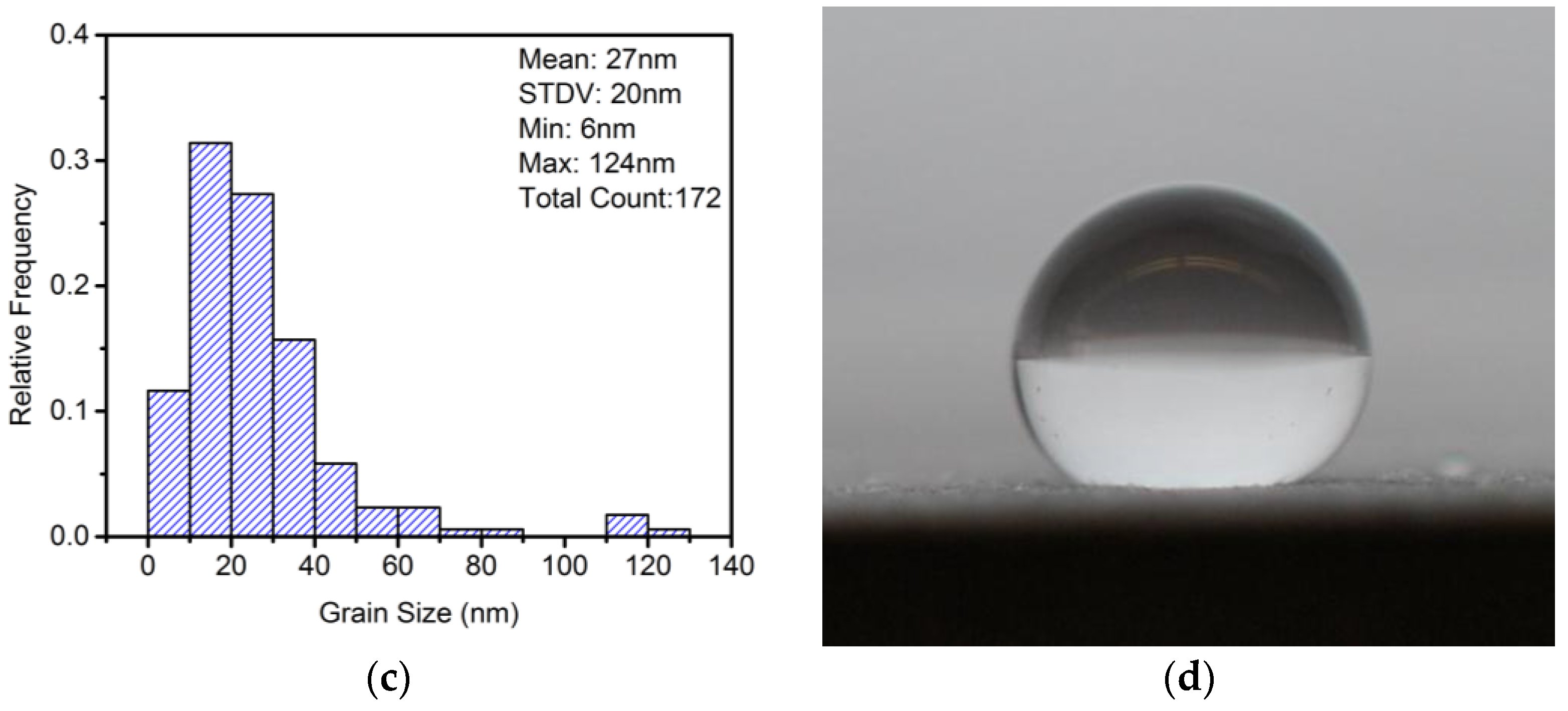 where γsv, γlv, γsl are the surface tensions for solid-vapour, liquid-vapour and solid-liquid interfaces, respectively, and θY is the contact angle of the liquid droplet (Figure 1a). For water, when the contact angle is less than 90°, the surface is said to be hydrophilic. Between 90° and 150°, the surface is hydrophobic. If the water contact angle is greater than 150°, the surface is defined to be superhydrophobic. However, the largest water contact angle θY reported for smooth solid surfaces is about 120° [26]. In order to achieve superhydrophobicity, surface roughness is also required.