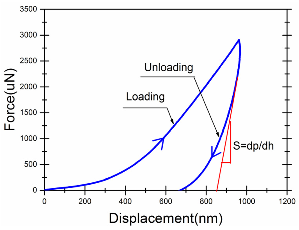 The nanoindentation tests were performed with a Hysitron Triboindenter fitted with a Berkovich tip (tip radius of 0.6 μm, angle of 142.3°). The indenter came into contact with the sample surface with a calibrated trapezoidal load function, as defined by a loading time of 5 s, a holding time of 2 s at a maximum load of 30 µN, and an unloading time of 5 s. A typical load–depth curve for indentation experiments was given in Figure 3. The contact stiffness (S) is defined as the slope of the unloading curve and given by [49,50,51]: